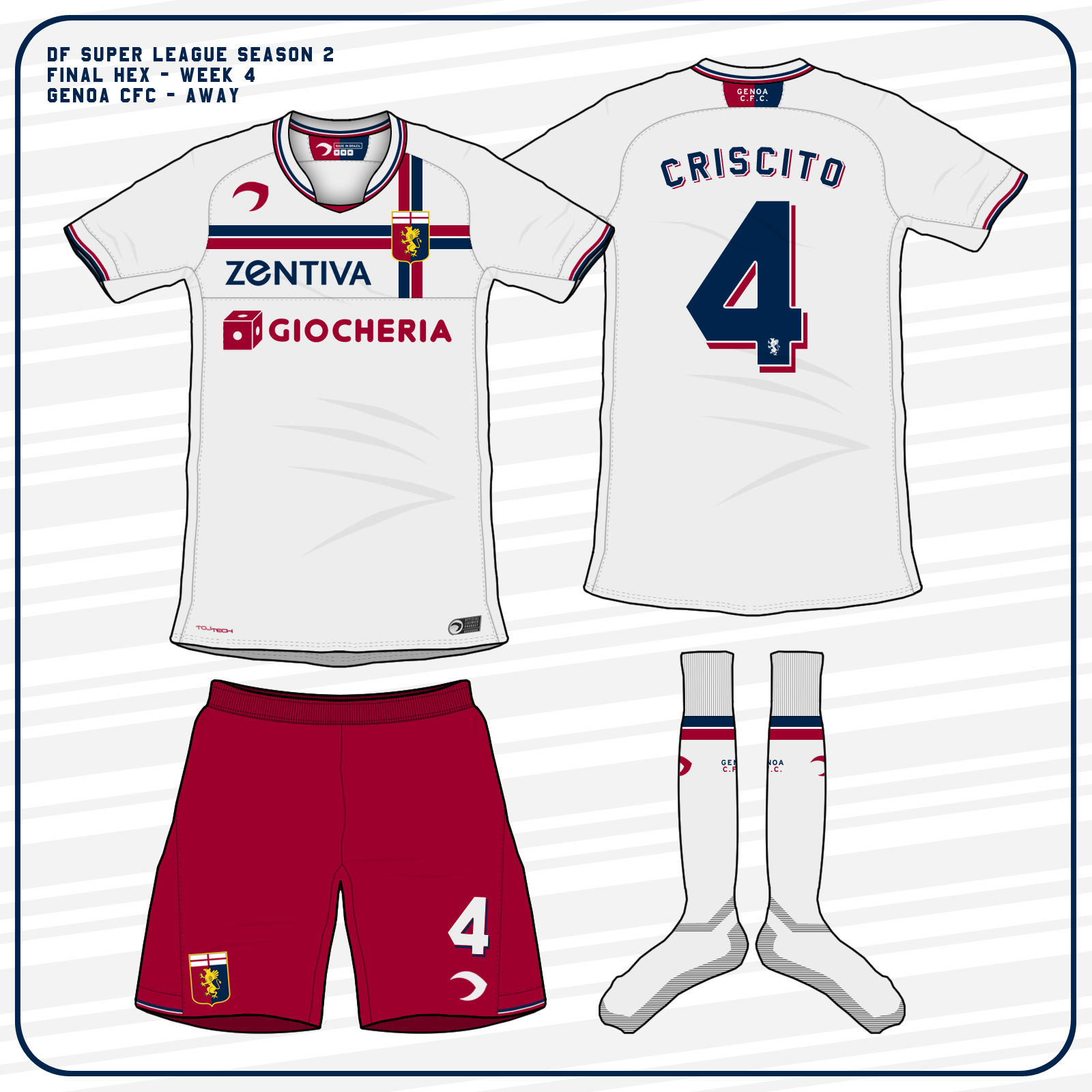 Away kit for Genoa CFC, featuring a stylized version of the St. George's cross in the colours of the club. Other details in navy, white and burgundy/dark red can be found on the sleeve cuffs, collar and shorts.
