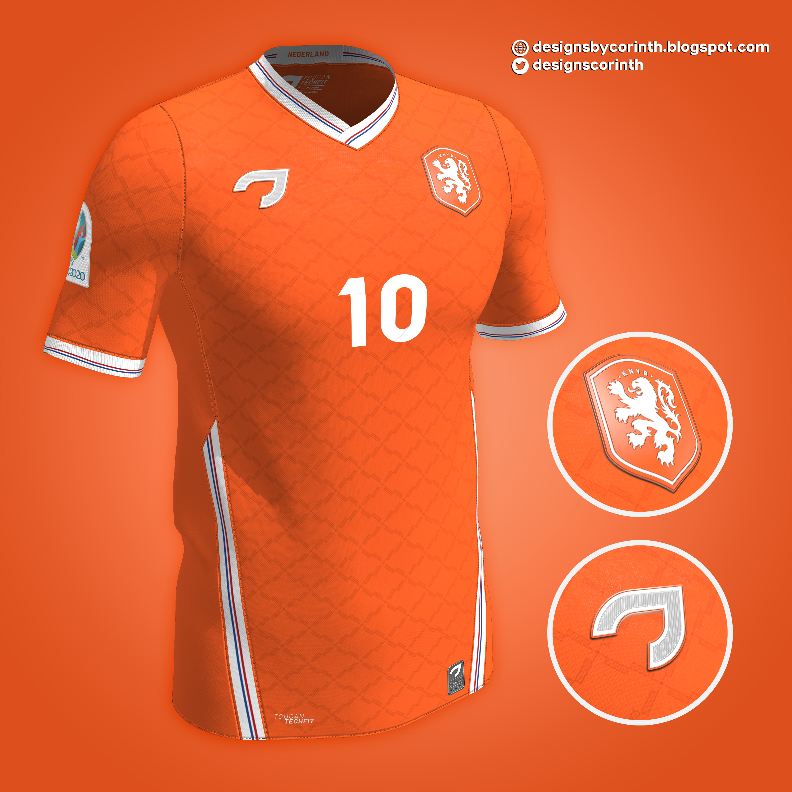 Home shirt for the dutch nationals team. The shirt is in their traditional orange color, and features a pattern consisting of windmill sails. Details in white, blue and red - colors of the dutch flag - are also present on the jersey.