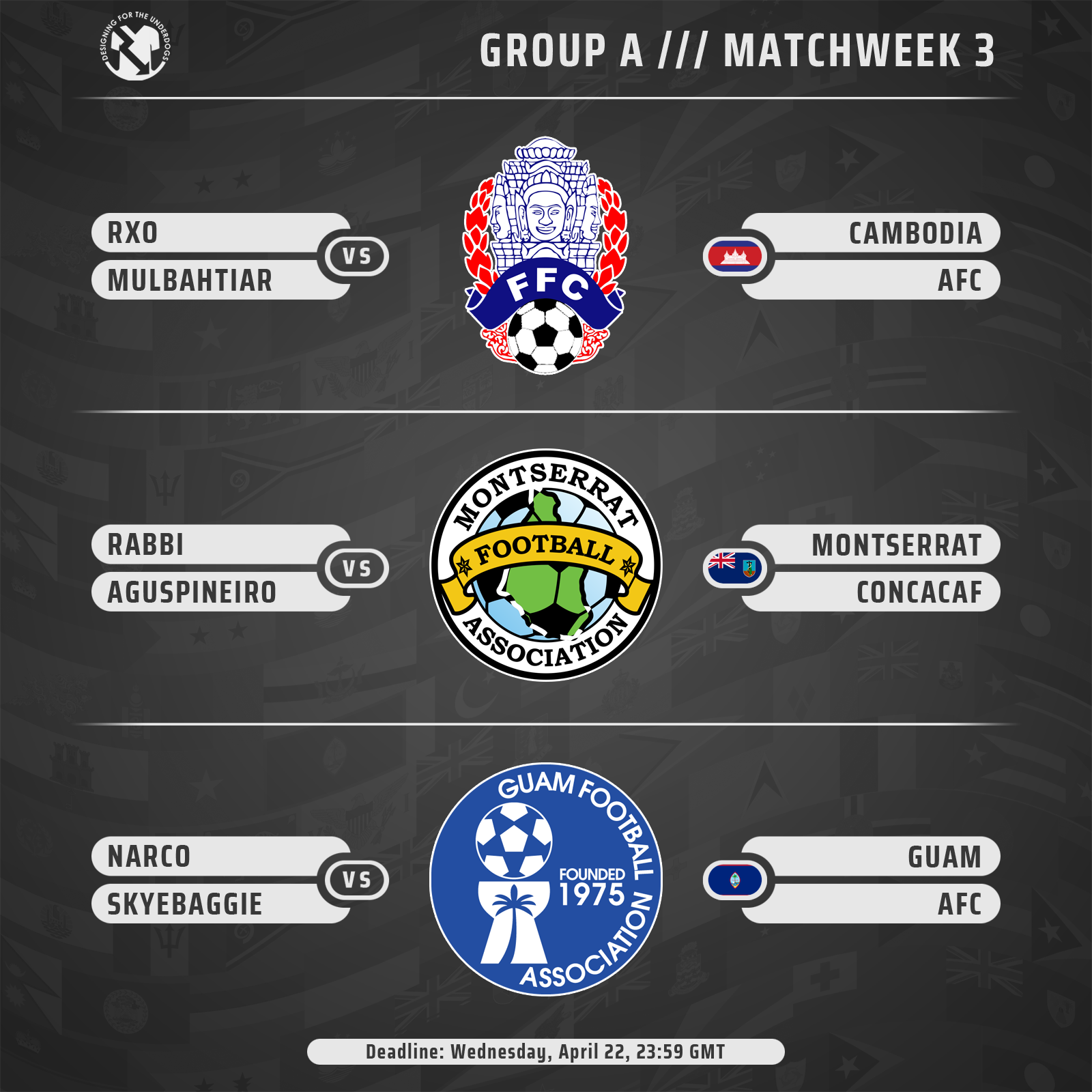 The deadline to upload the designs is April 22, 23:59 GMT. Failing to do so will result in a 0-10 loss.