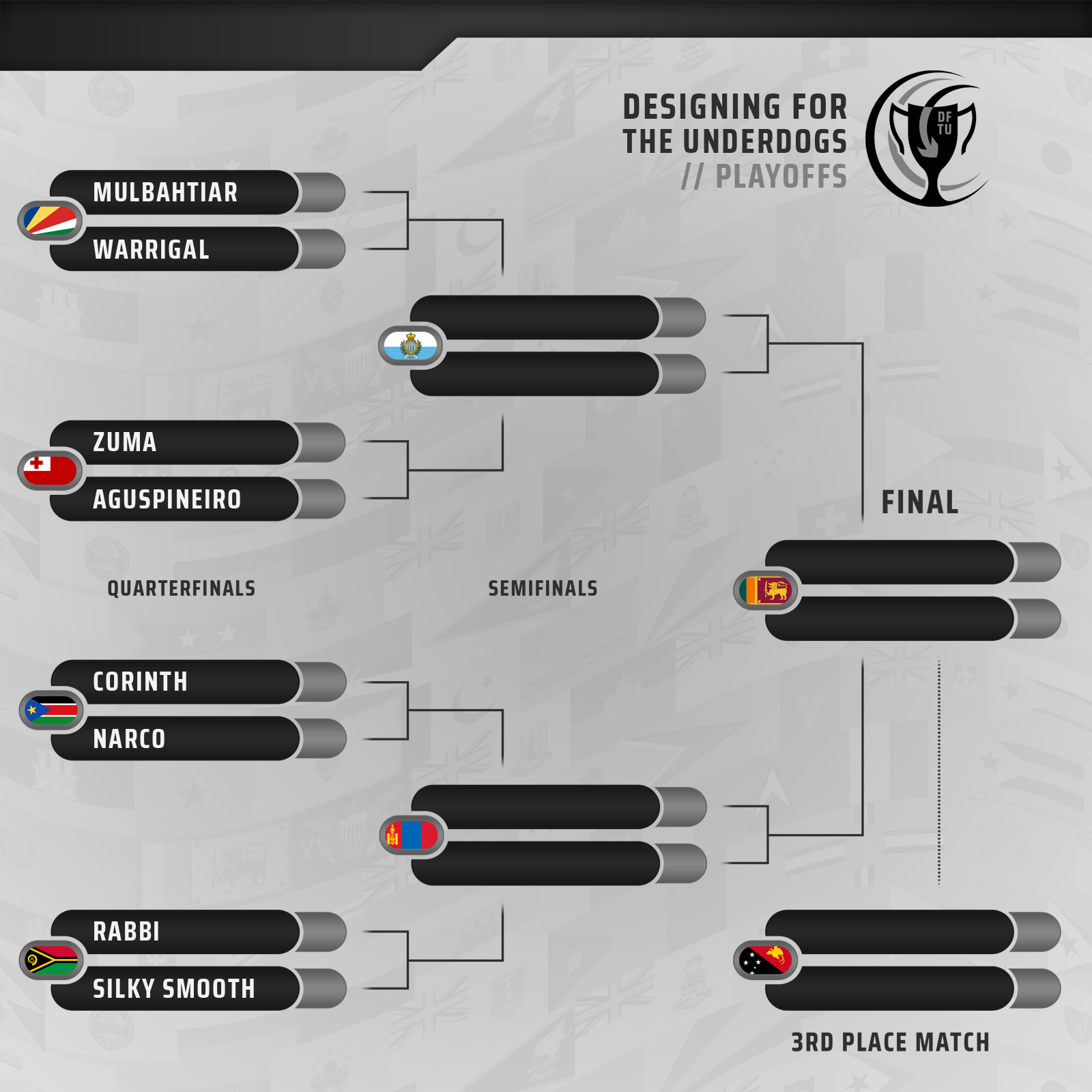 Here is the bracket for the playoffs. The semifinals will feature the national teams of San Marino and Mongolia, while the 3rd place match and final will feature Papua New Guinea and Sri Lanka, respectively.