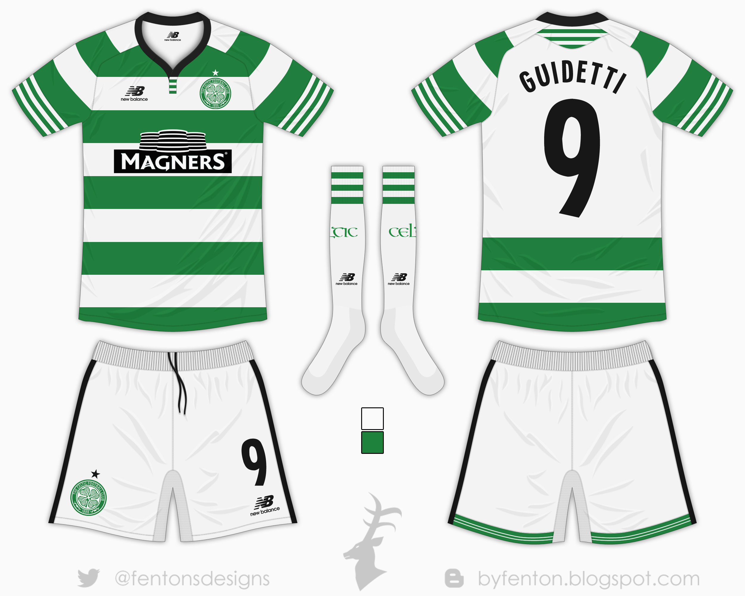 As New Balance will be a newcomer to the Football Kit world, I've designed this kit to be a mixture of old and new ideas... The tradition of unbroken hoops remains however some new features for Celtic include a black collar in a baseball style to also incorporate an American flavour... Another new feature of the kit is in the design of the socks. The New Balance logo is placed on the sides of the ankles whilst the highlight is the oversized "Celtic" text.