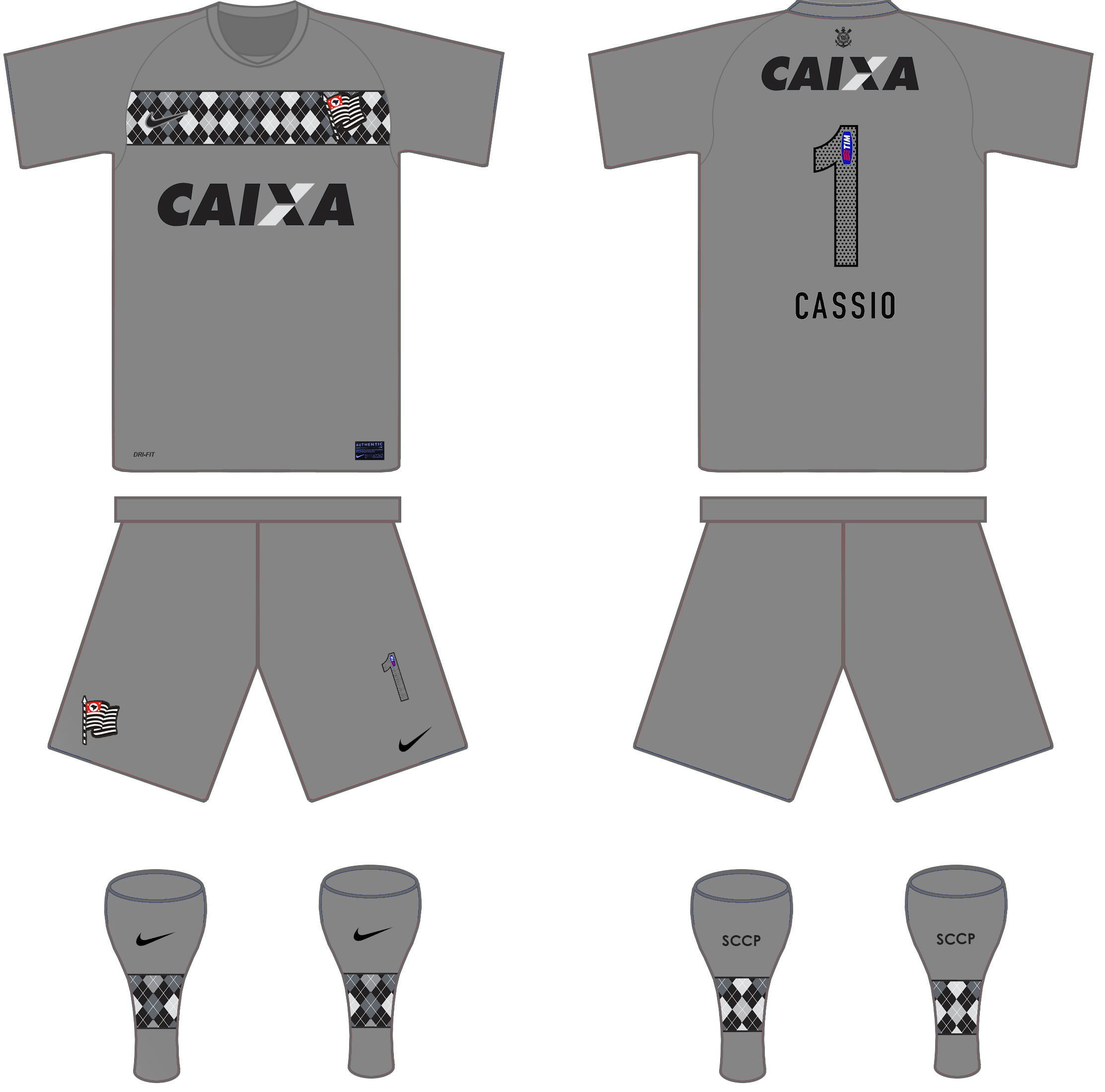 I tried to go for a simple yet different design for this one. As well as the home and way kits, it features a simplified version of the crest (only the flag of São Paulo). The kit is all grey, white a single horizontal stripe in an Argyle pattern, which can also be seen on the socks.