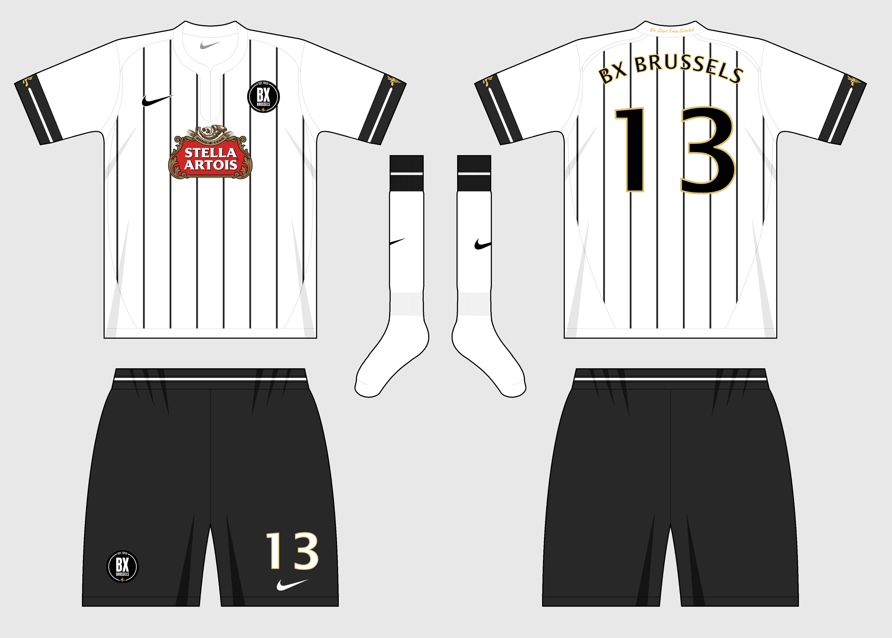The home kit features the gold logo from the badge and Brussels flag on the cuffs of the sleeves along with the thin white band which I took from the logo aswell. The white cross with the gold outline is to symbolise the \'X\' in \'BX Brussels\'.