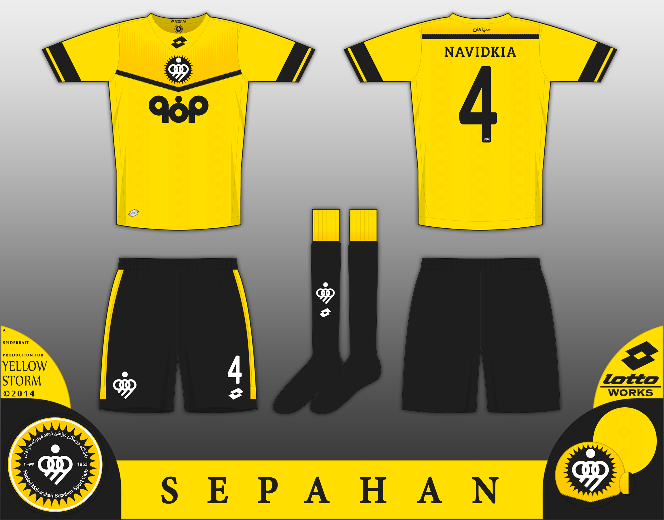 Home kit for Sepahan. The team were founded in 1953, and are one of the biggest clubs in Iran, and hold the record for most professional league championships (4) since the leagues foundation in 2001-2002. The club are named after one of the English renditions of Isfahan. The kit here is in the tradtional yellow shirts with black shorts. The crest is the symbol of the club with the black sun from the full crest backing it on the shirt, and just the symbol on the socks and shorts. The shirt has a black chevron, woven into the shirt, and above it is a halftone effect, comprised of a golden yellow shade and a tone midway between the shade on the main shirt, and the one on the halftone. This symbolises one of the teams nicknames (The Yellow Storm) and a flame effect, fire is an important symbol in the Iranian culture. There are similar gradient effects on the back of the shirt, and on the shorts and the sock turnovers. The shirt, on the front and the back has a jacquard print woven into the body, consisting of a Persian Border pattern, and a star symbol, both inspired by persian rugs. The Star symbolises good luck. Isfahan is famous for being the centre of rug craft in Iran. On the back of the shirt is the team name in Persian Script. Please click on the zoom button. Comments would be cool.