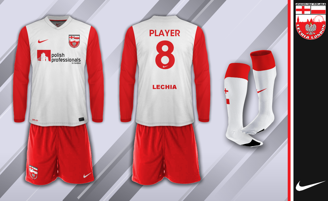 Similar to the Polish national kit the club's home colours are a white shirt with red sleeves and red trim, red shorts and white socks. Small England and Poland flag detail on the socks.