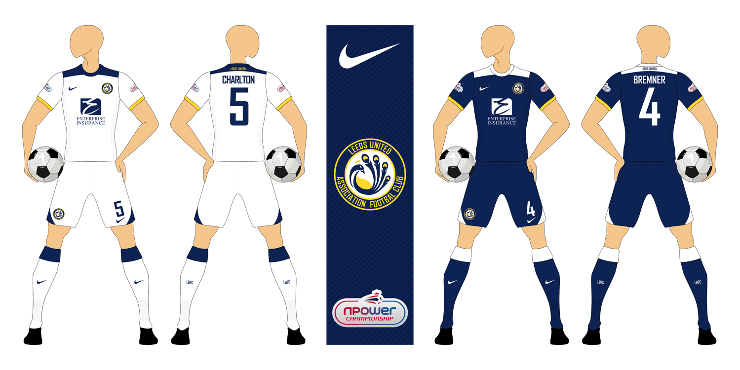 This is my feirst design in the Leeds United kit and crest competition. I used nike as brand, and the \"enterprise insurance\" as sponsor... I hope you can get a clear view on the badge...