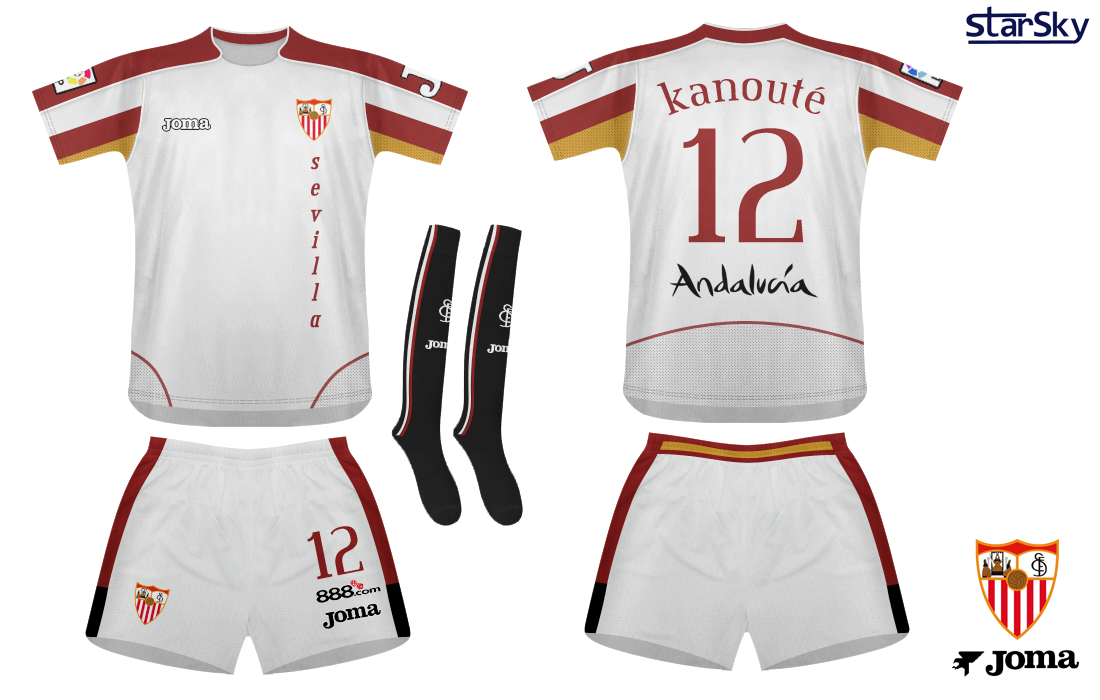 Sevilla Red stripe down the shoulder and sleeve which continues in to a raised collar. As most recent Sevilla kits have included Spanish flag detail, i have kept this feature but made it less promininent by placing it on the underside of the sleeves. Mesh at the bottom of the back the kit with red trim.