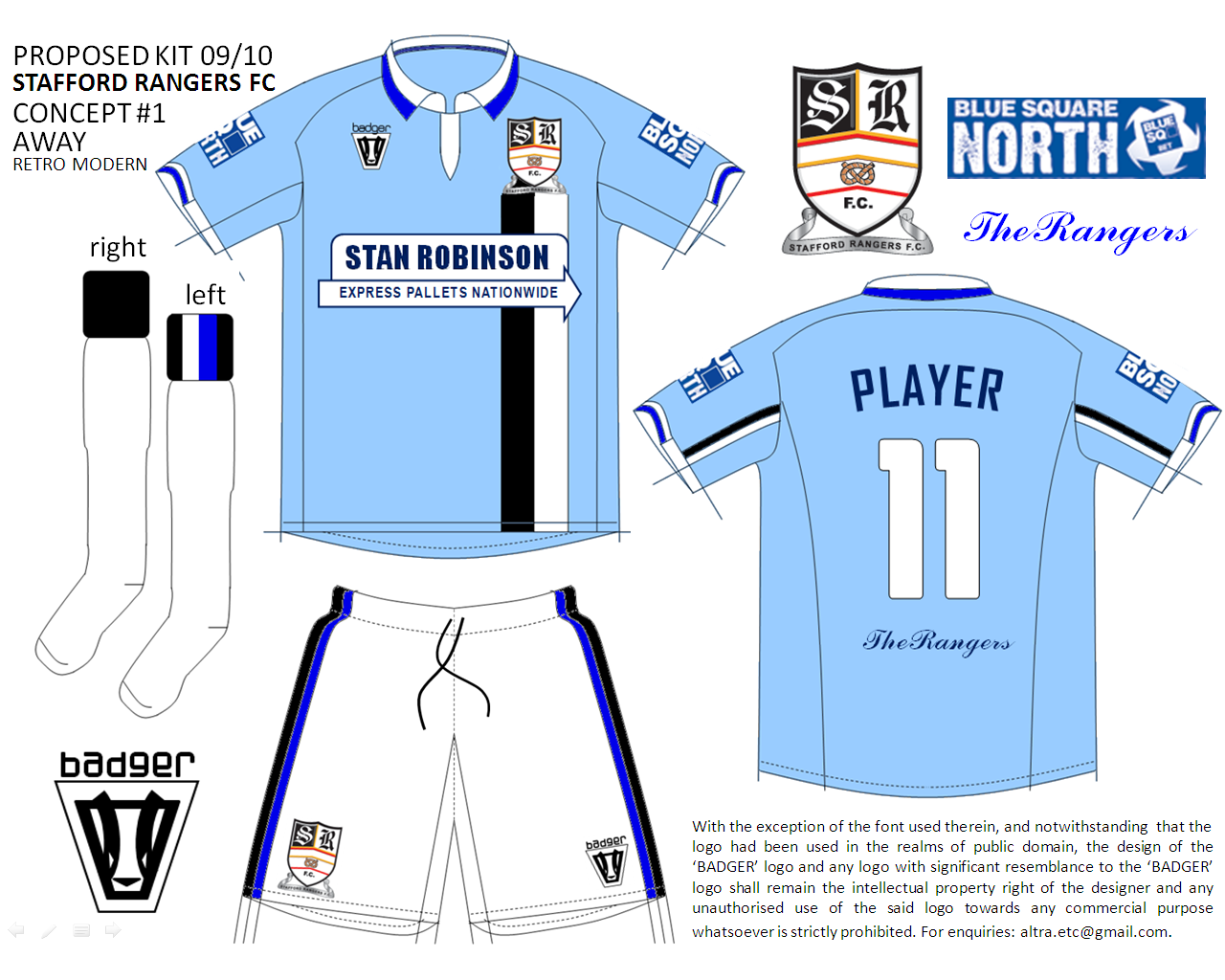 Like the concept of the home jersey, the away jersey also adopts the ‘retro modern’ concept particularly in the black and white panel on the left side of the chest. The panel was designed in such a way that the Stafford Rangers FC’s emblem is placed at the pinnacle, as opposed to many kits which had used such designs usually running down the whole length of the jersey. The placement of the black and white colours on the panel follows the traditional colours on the Stafford Rangers FC’s emblem. This unique design represents the club’s philosophies and struggles being upheld by the supporters with utmost pride.