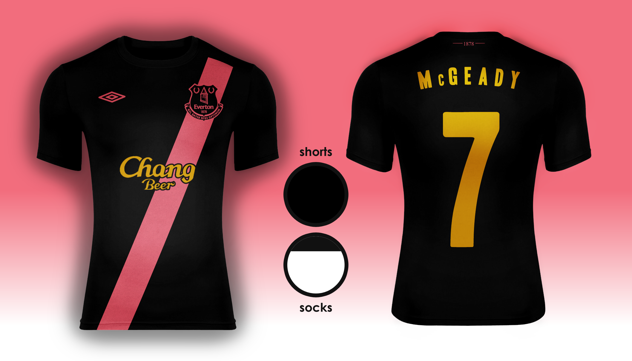 • Generic Description: This kit is inspired by one of the first ever Everton kits, from the 1881-1882 season. It was a classy black number with red sash, but I have modernised it by borrowing the traditional pink from other Everton away kits over the years to replace the red. Having red on an Everton kit would perhaps cause some friction, for obvious reasons. The sponsor and name/number are in gold, which I always feel enhance a kit. Everton might well be wearing their third kit in the Champions League next season, remember!