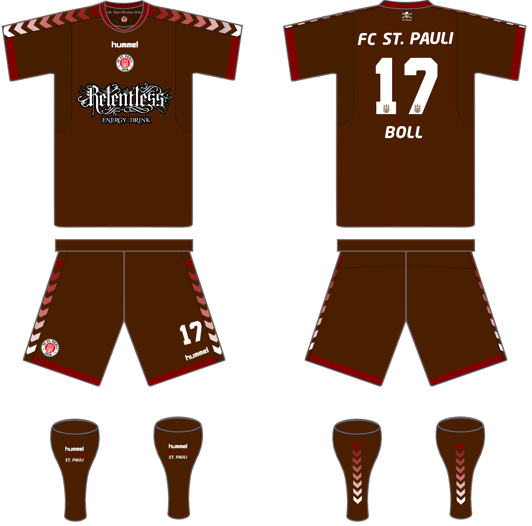 • Generic Description: The St. Pauli's traditional brown kit with thin red vertical lines and hummel's arrows fading from red to white on the shoulders. Inside the collar, the inscription "St. Pauli We love you!" can be seen. On the back of the kit, near the collar, a jolly roger (one of the symbols of the team) can be found.