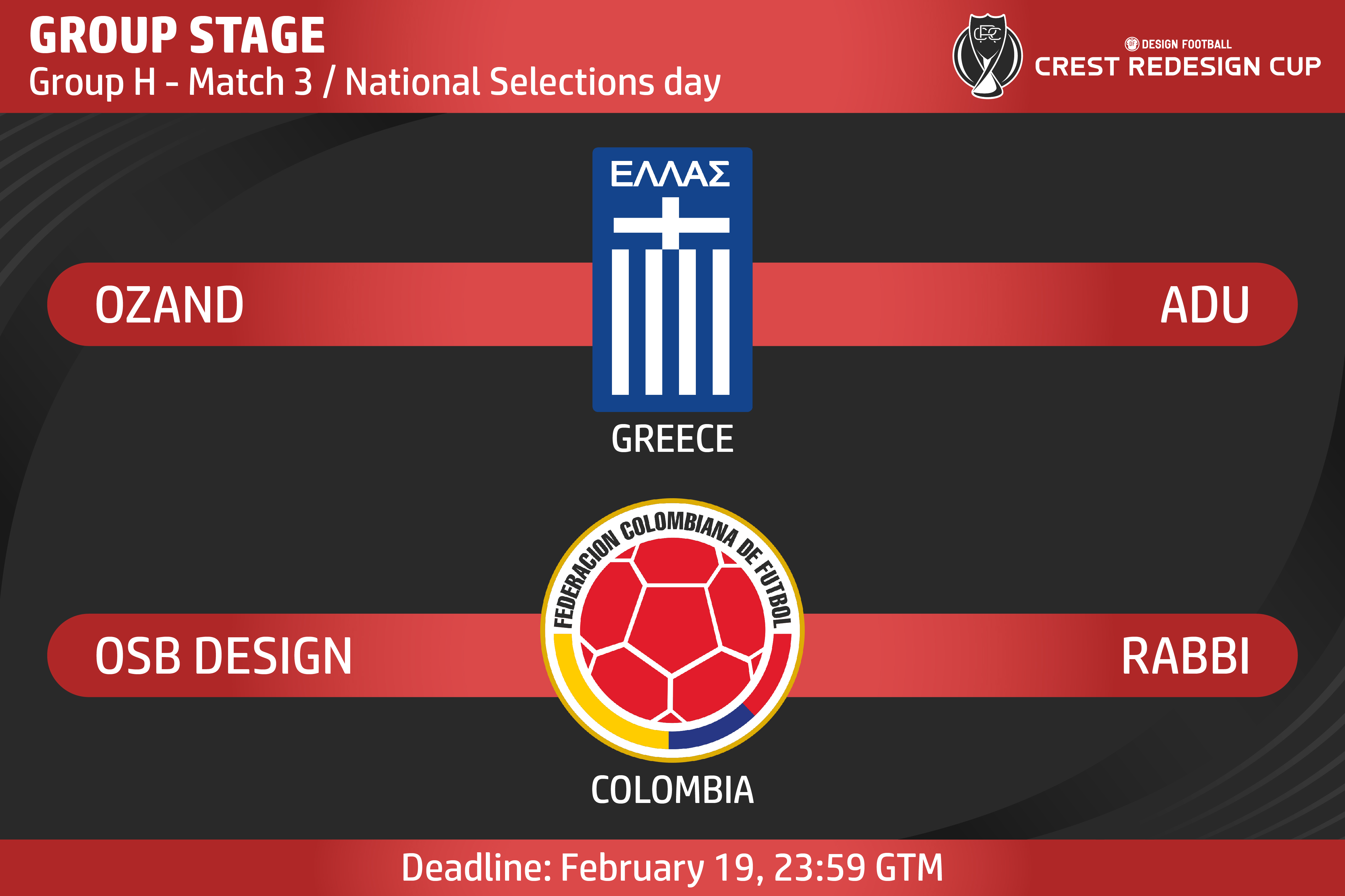 • Generic Description: DEADLINE: February 19, 23:59 GTM //// REMEMBER: TRY TO USE AN IMAGE AT LEAST 1000PX IN SIZE, SINCE THE FRAME USED IN THE VOTING IS 1000PX X 1000PX. //// IMPORTANT: YOU MUST ATTACH YOUR DESIGN IN PNG. OR JPG. ON WHITE BACKGROUND. YOU CAN UPDATE AS PAGES: Imgur.com Subfotos.com OR THE ONE YOU PREFER. YOU MUST DO IT IN THE DESCRIPTION OR IN THE COMMENT BOX //// LAST MATCH OF THE GROUP PHASE! WITH NATIONAL SELECTIONS. THE CLASSIFIED ARE DEFINED IN THE NEXT ROUND! GOOD LUCK!