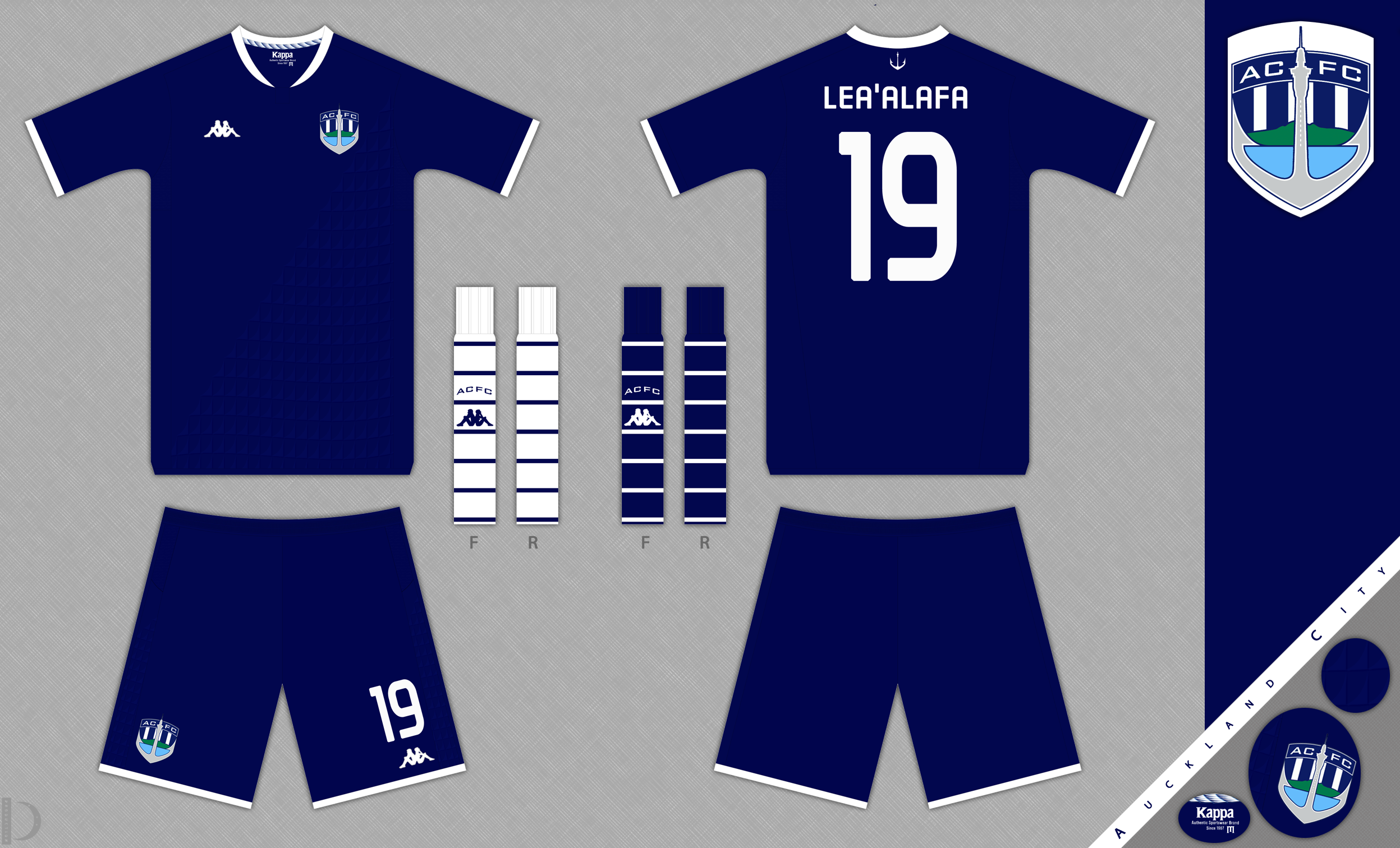 • Generic Description: Home kit for Auckland, this is in the usual navy blue, with a pair of white stockings and a pair of blue, both with thin hoops.