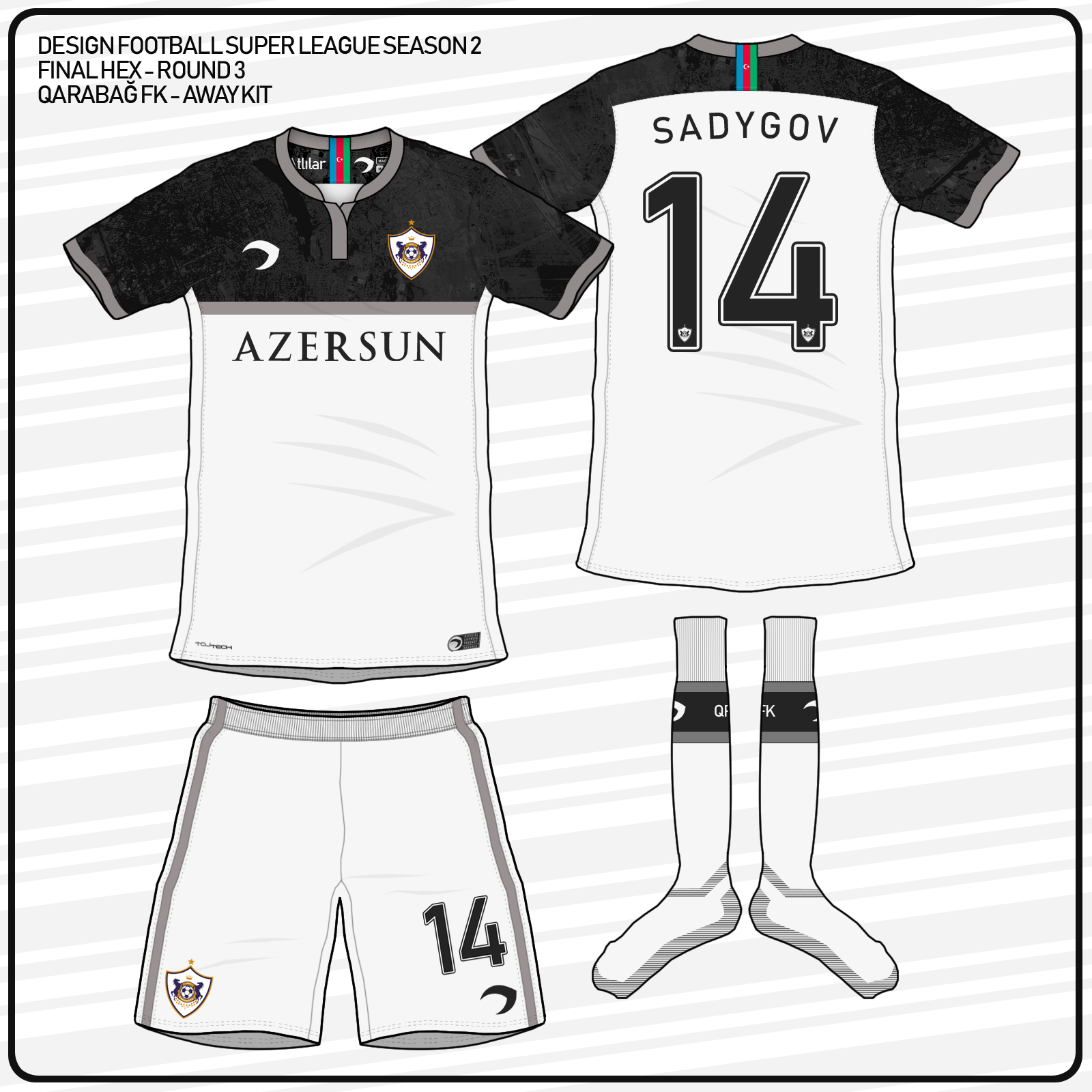 • Generic Description: Away kit for Qarabağ FK, in their traditional white color. The design also features a grey and black panel in the upper shirt, where a graphic of a map of Baku (especifically, the region around Azersun Arena) can also be seen.
