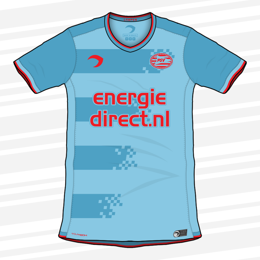 • Generic Description: Shirt loosely based on the current USA kits. However, I decided to use a chequered pattern on the end of each hoop, a reference to the North Brabant region in the Netherlands (and an element often used on PSV's kits throughout history).