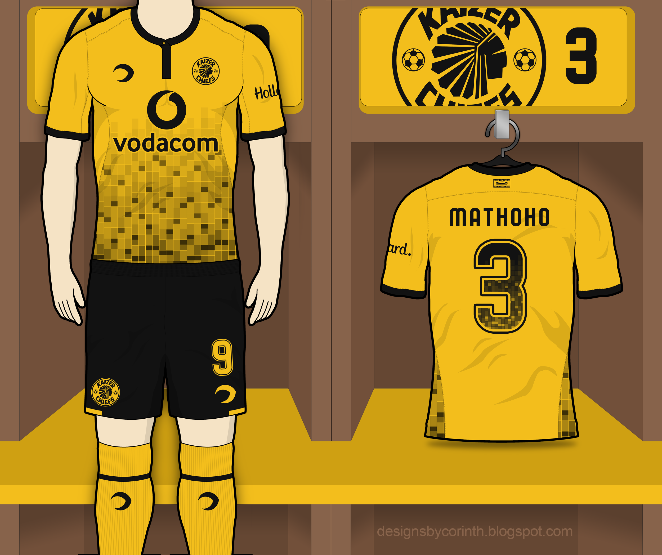 • Generic Description: Home kit for South African side Kaizer Chiefs, in their traditional yellow-black-yellow combination. The main design element is a graphic inspired by the Soccer City Stadium's (also known as FNB Stadium) façade. Below the collar on the back of the shirt there's also a seal celebrating the stadium's 30th anniversary (also, its 10th anniversary since renovated in 2009 for the 2010 WC).