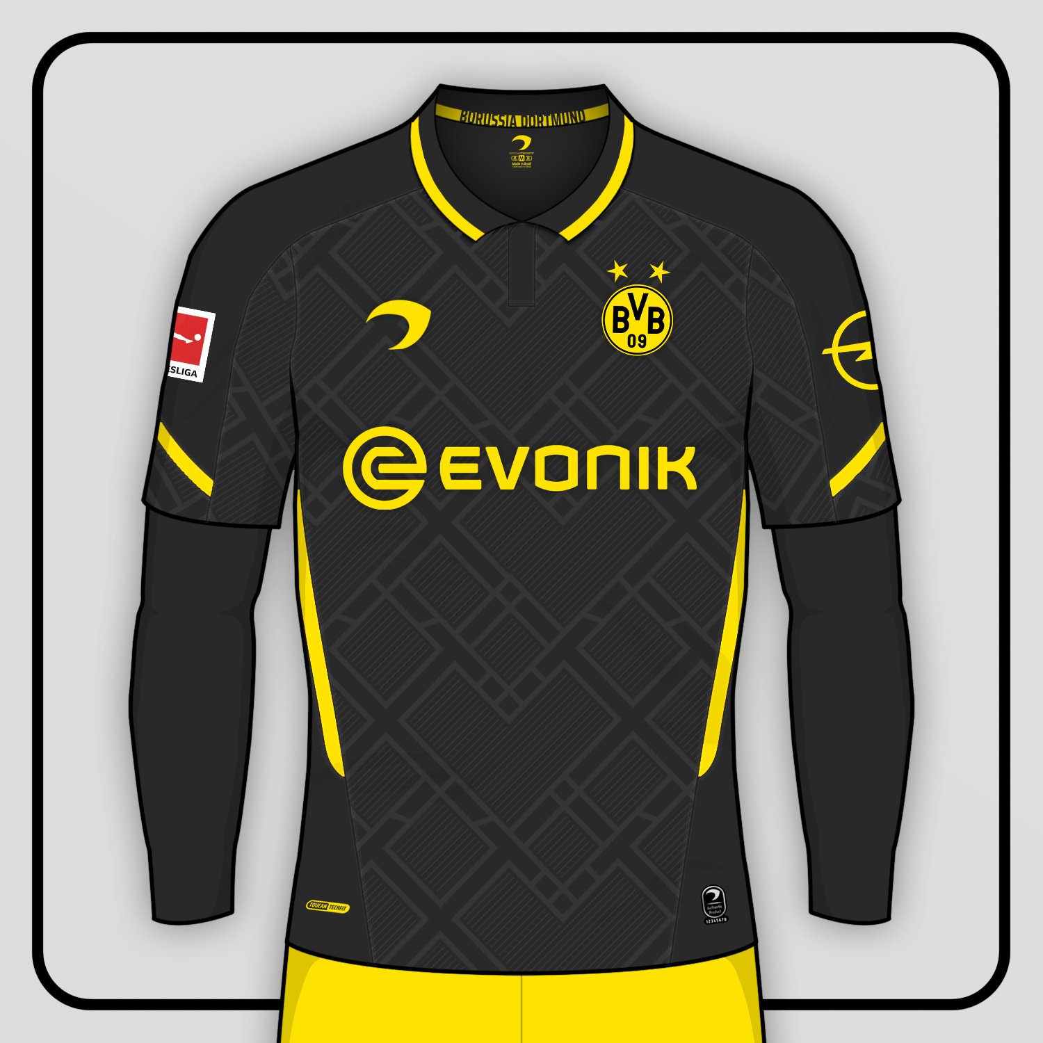 • Generic Description: Away kit for Borussia Dortmund, inspired by the City of Dortmund's mining past - a pattern consisting of hammers and chisels can be seen on the shirt, while the black colour of the shirt is a reference to coal-mining.