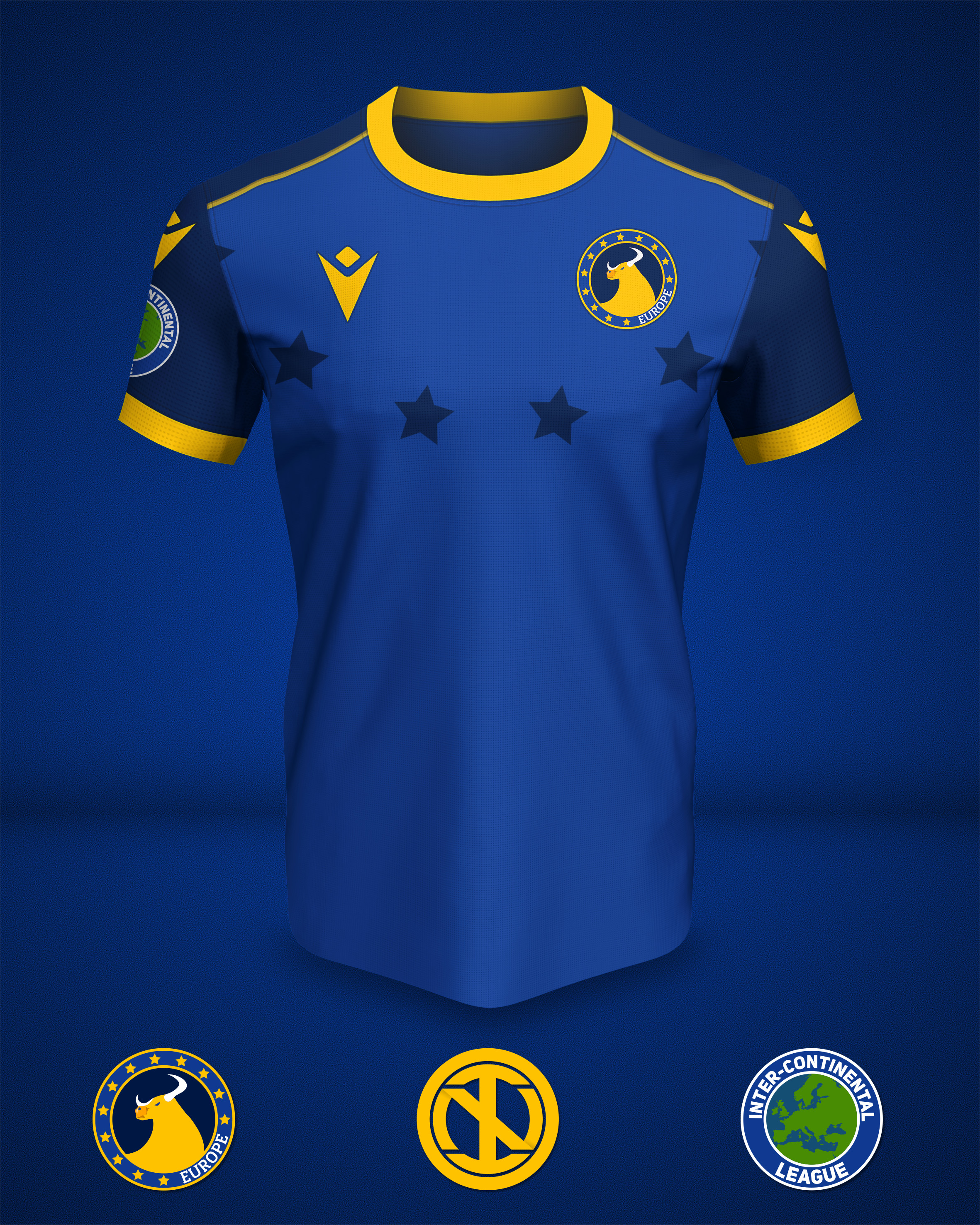 • Generic Description: Home kit and crest concepts created for a fictional European team. The colours chosen are blue and yellow, which are featured in the European Union flag. The EU flag also served as an inspiration for the crest, where we can find the same 12 golden stars. Another element of the crest is the bull, which is a reference to the ancient Greek myth of Europa.