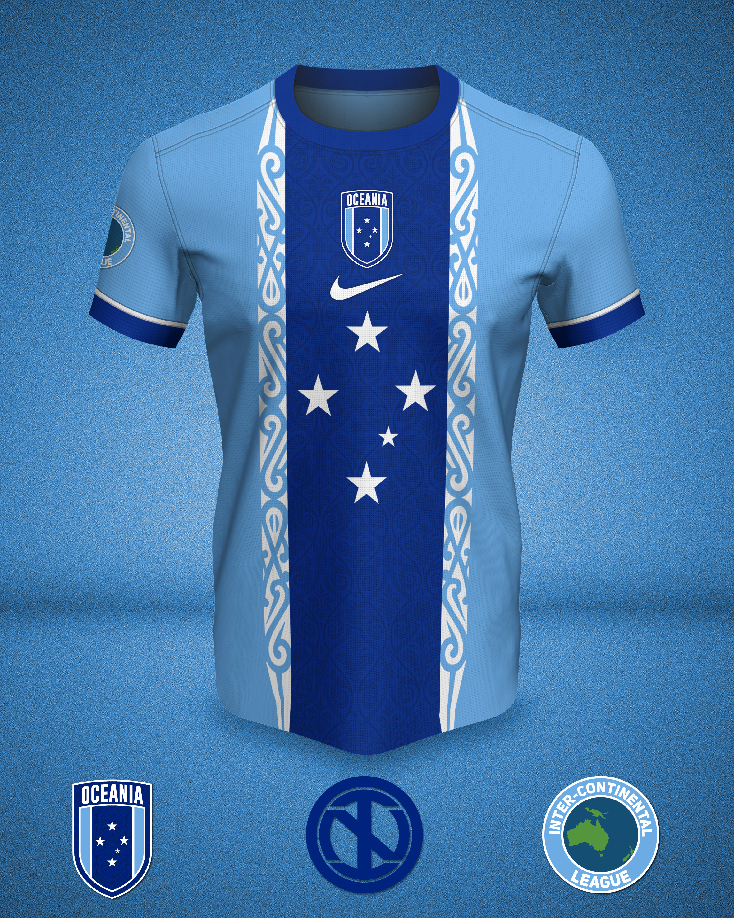 • Generic Description: Kit and crest design for the Oceanian team. Both the crest and the kit are inspired by a proposed "Flag of Oceania", which consists of a dark blue stripe boarded in white (which represent rivers and oceans in and bordering the continent) on a light blue background (symbolizing the skies of Oceania). The kit is a reproduction of the flag featuring two different aboriginal patterns in the blue and white stripes; the pattern in the blue stripe is also found in the darker parts of the crest.