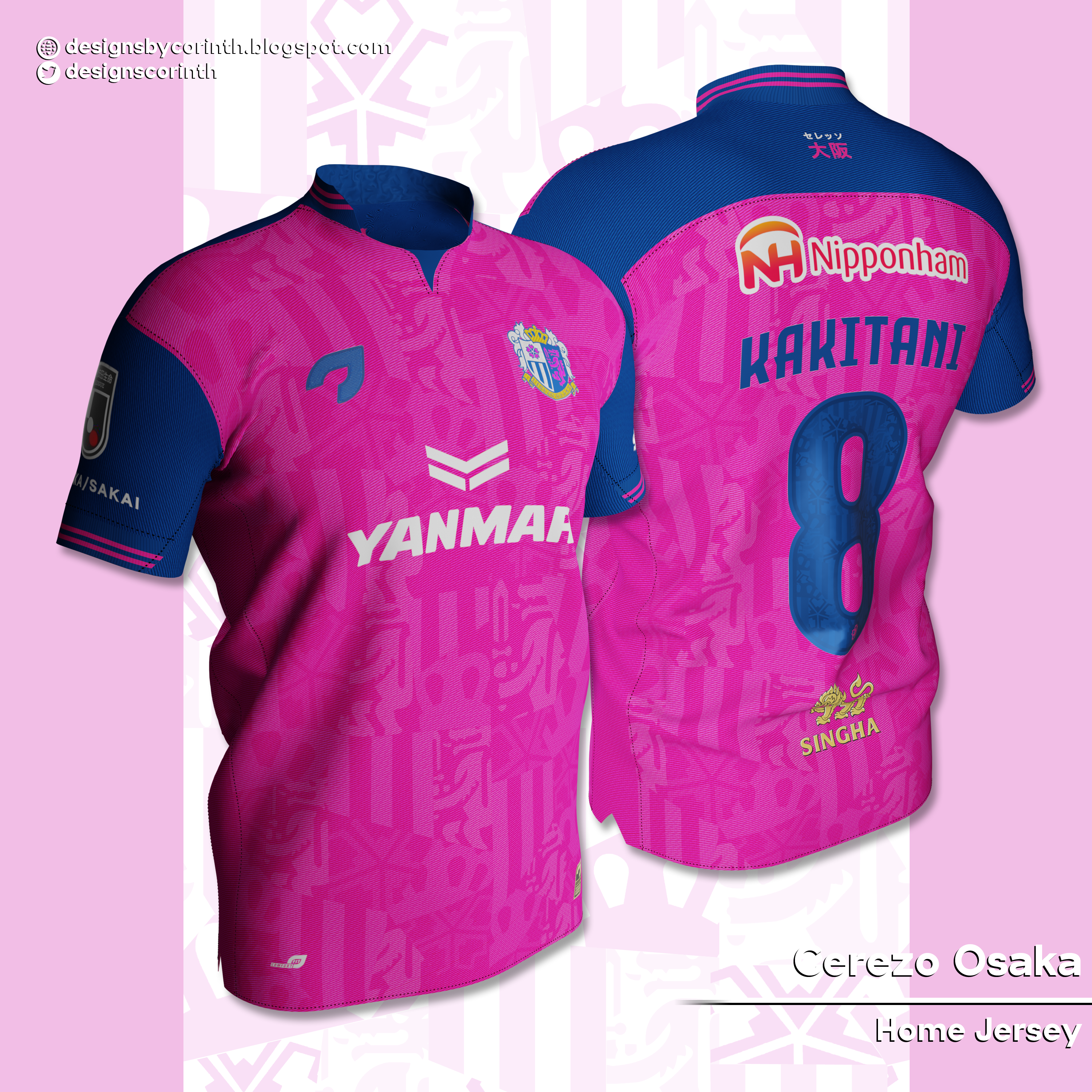 • Generic Description: Home jersey for Japanese side Cerezo Osaka. The jersey is mainly pink and features a pattern consisting of crest elements organized in an 'abstract' (for a lack of a better definition) way. The sleeves are navy. The kit is completed by navy shorts and socks.