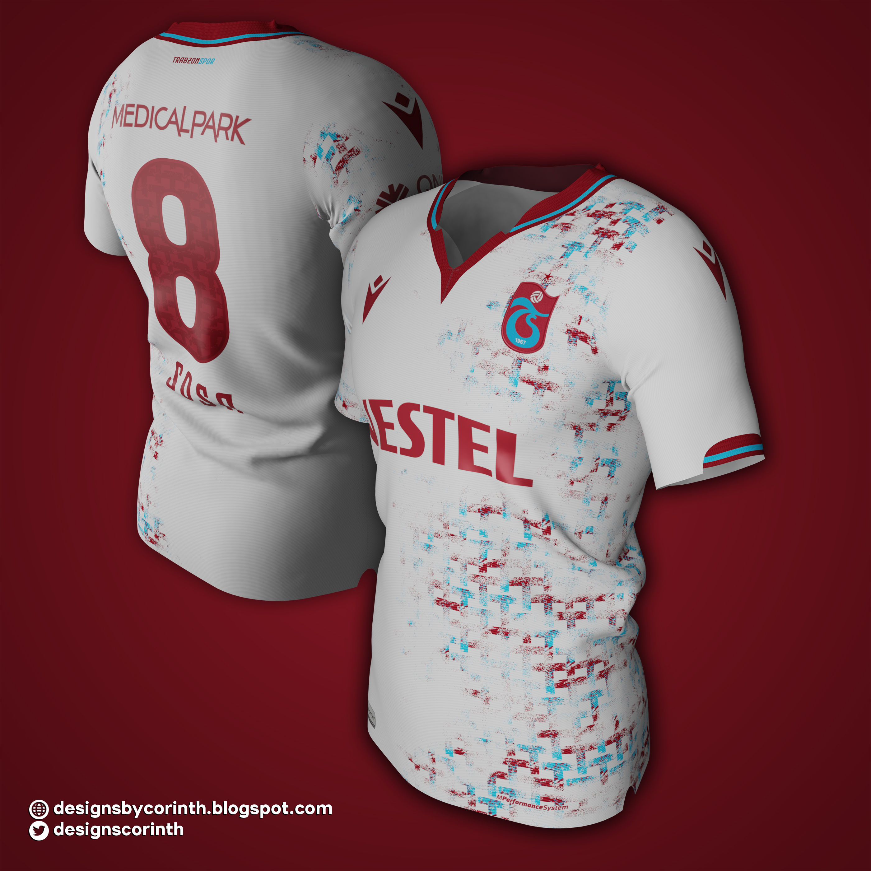 • Generic Description: Away shirt for Turkish side Trabzonspor. The distinctive feature of the shirt is a pattern consisting of intertwined 'T's - a reference to the club's name - in blue and maroon.