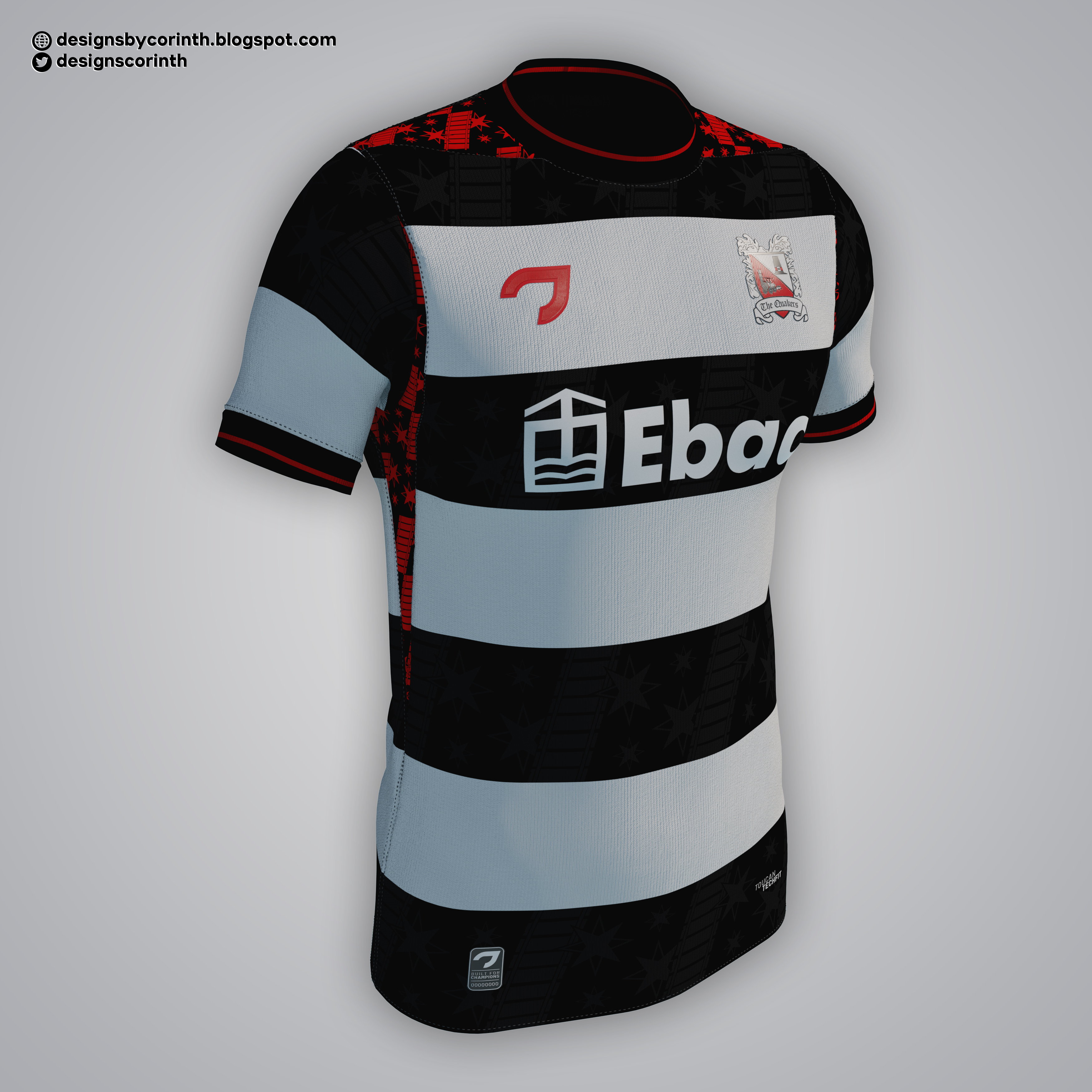 • Generic Description: Home shirt for Darlington FC. Their crest features a Locomotion No 1 and a Quaker hat, so I decided to do something inspired by that: the pattern found on the hoops and the red details consists of railroads and the symbol used by the Society of Friends (Quakers).