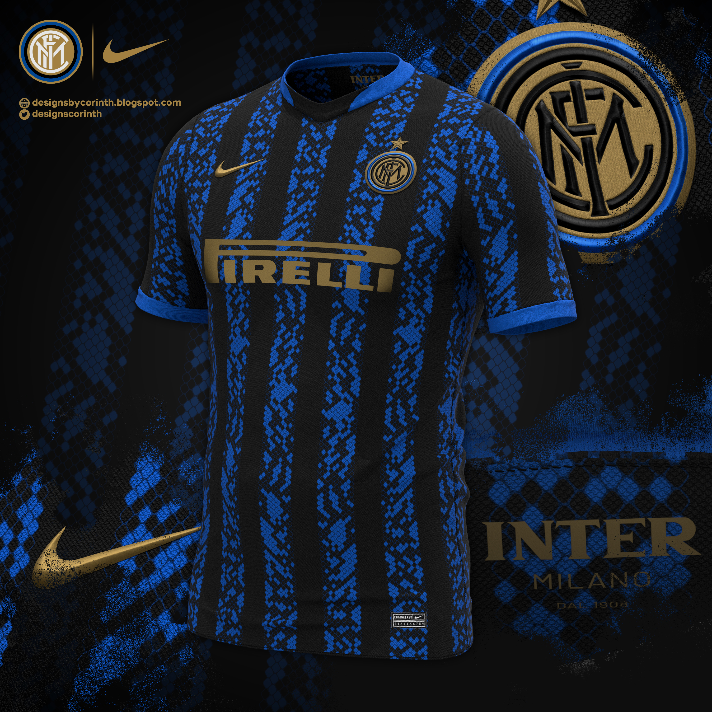 • Generic Description: This is my take on a possible 2021-22 home shirt design for Italian side Internazionale, based on a leaked hoodie design from next season's collection. The jersey features Inter's nerazzuri colours, but the striped design features a unique snakeskin pattern, possibly a nod to the fashin industry in Milan (and maybe the Biscione, one the symbols of the city of Milan and Inter itself).