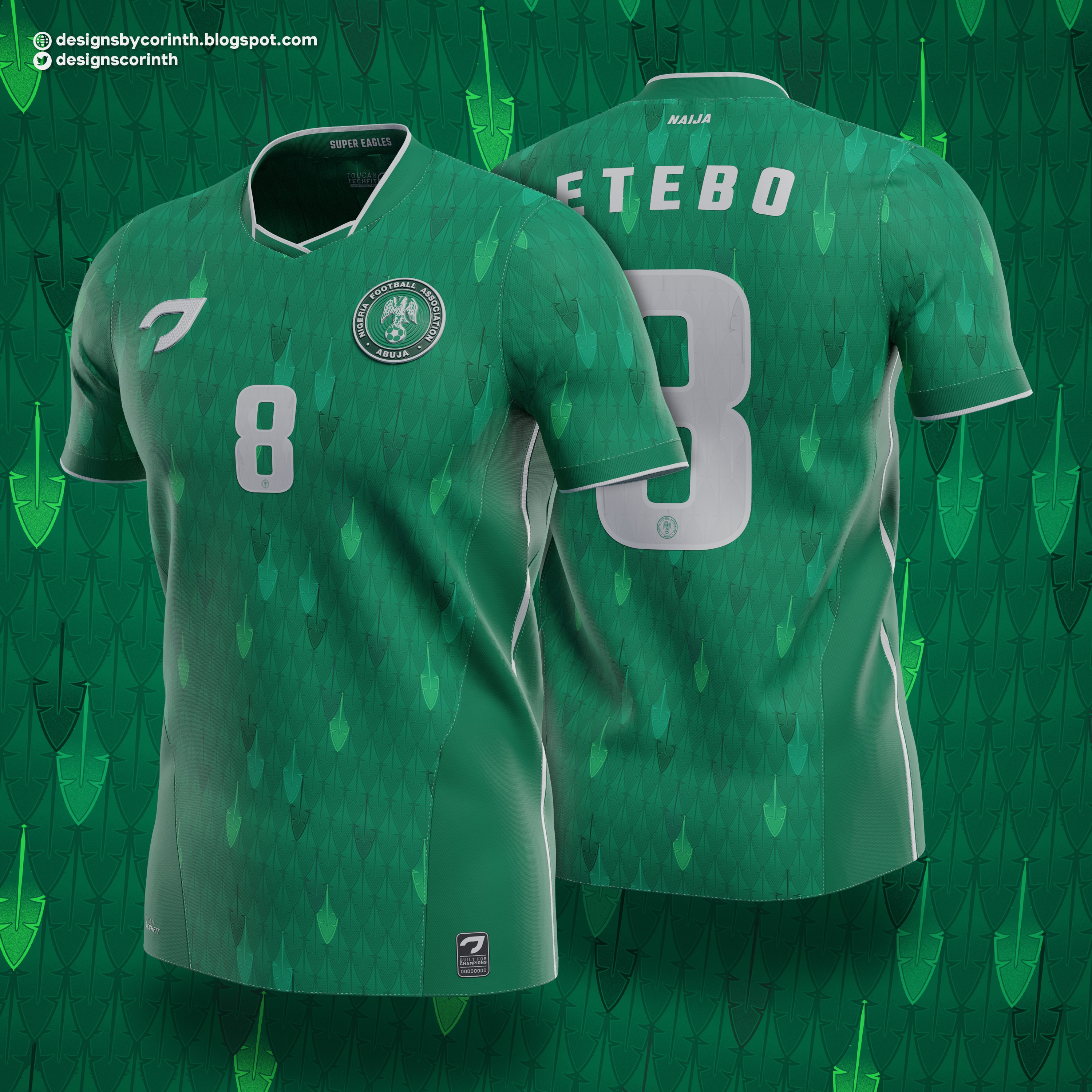 • Generic Description: Home shirt for the Nigerian national team, inspired by their nickname, 'the super eagles'. The shirt is green with a distinctive all-over pattern that represents the feathers of an eagle.