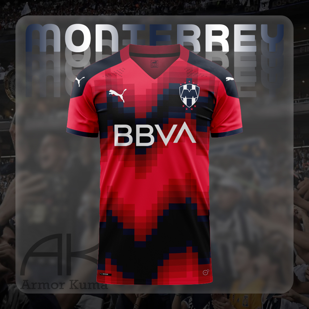 • Generic Description: This Monterrey third kit is inspired by the works of Felipe Pantone located in the mexican city: a checkered blue and red motif on a bright red base.