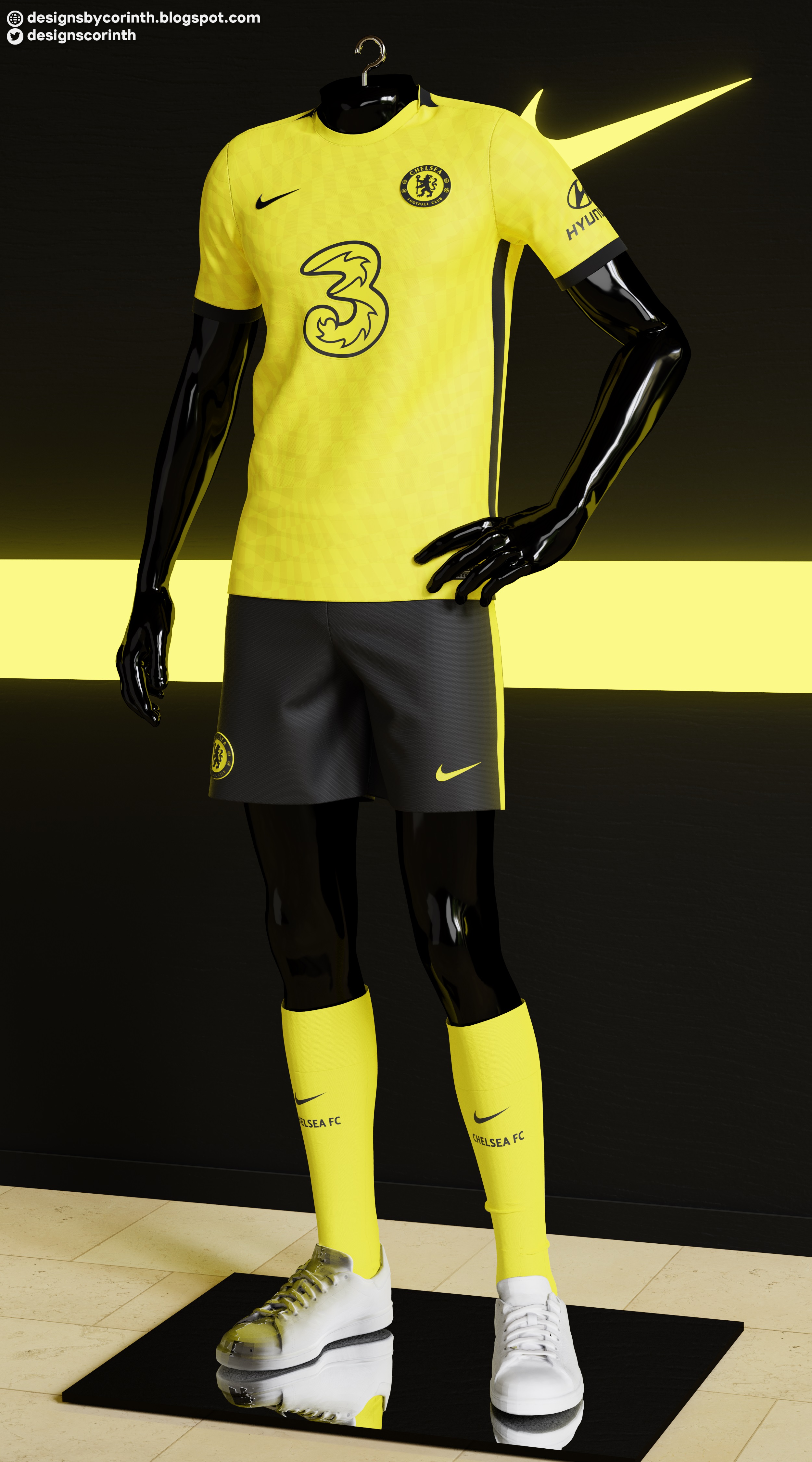 • Generic Description: Chelsea 2021/22 away kit prediction. I created this design to test yet another mannequin/avatar. The design itself is based on leaked info that suggest Chelsea's next away kit will be yellow and black, likely with a distorted chequered pattern.
