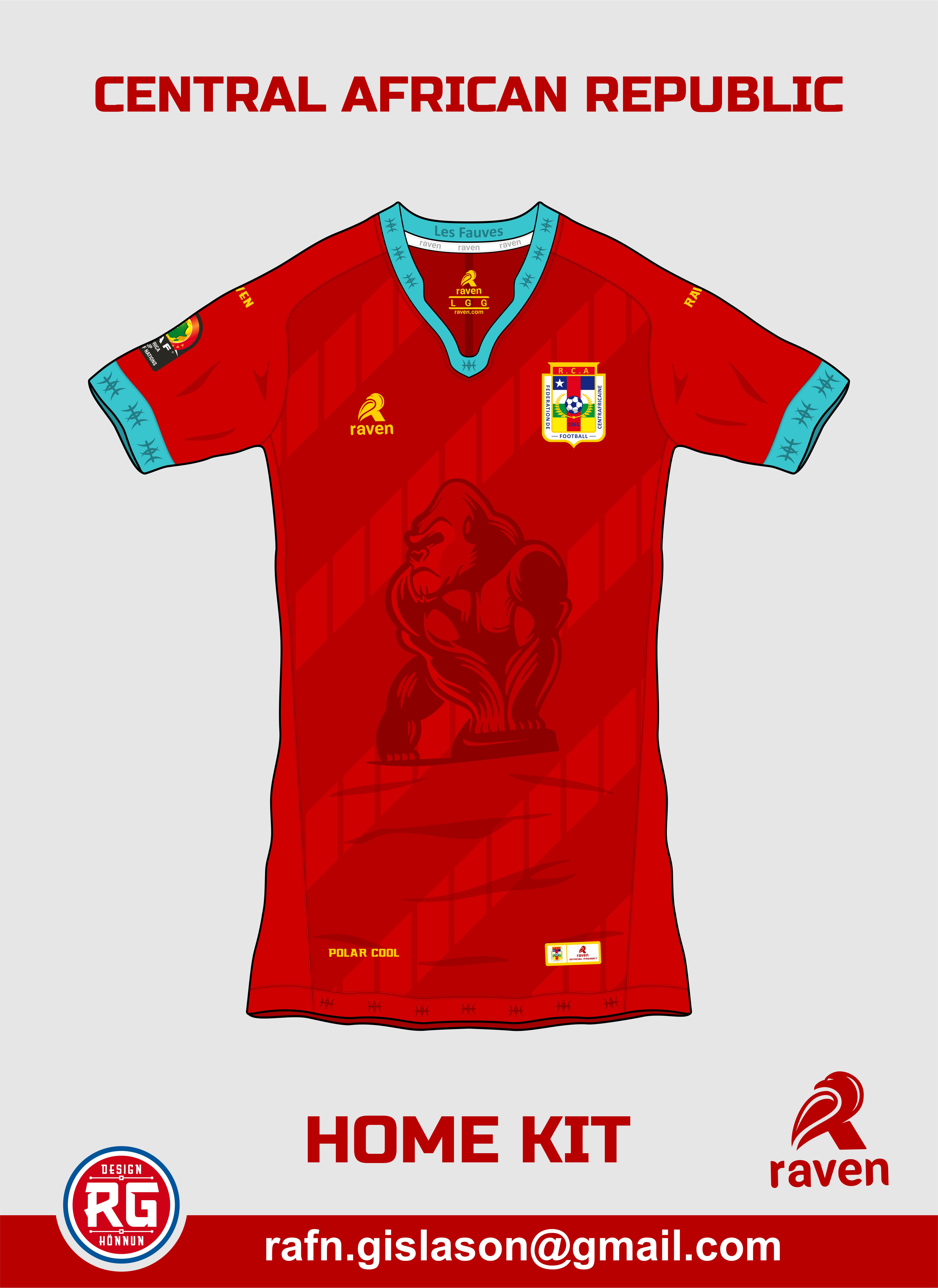• Generic Description: I believe the the C.A.R use a dark red color on their shirt to day with a turquoise trimmings, from the beginning of 2021 they have a Gorilla watermark on their kits as a effort to underline the need of conservation of the Gorillas in Central Africa.