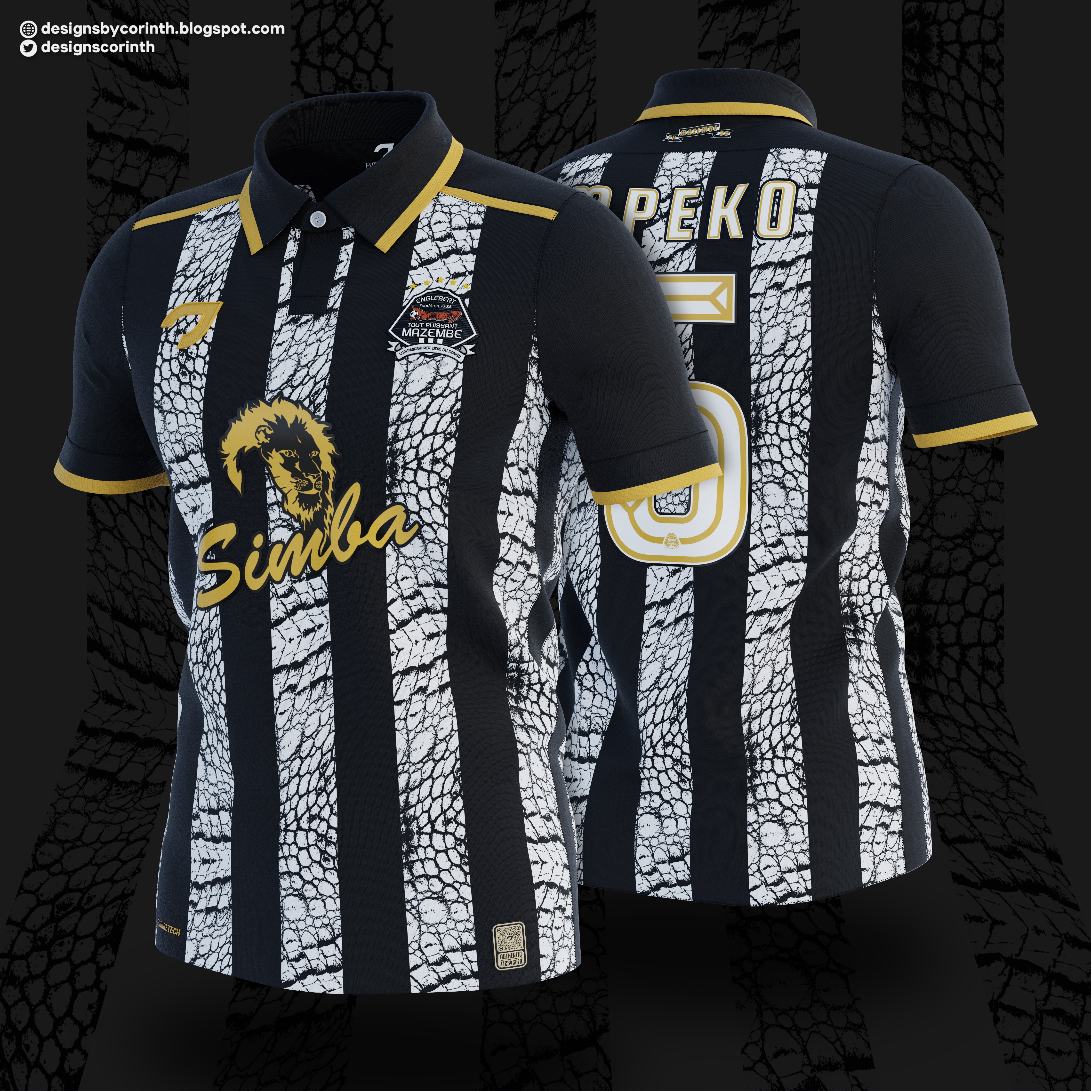 • Generic Description: Home shirt concept for Congolese club Tout Puissant Mazembe. Reptile skin seems to have become a trend lately with Inter's kit, so I decided to use a similar concept to my version of a Mazembe's home shirt. haha The jersey is predominantly black with white stripes. Those stripes feature a crocodile skin pattern - a reference to the club's crest and an element which is often used by the club itself. Golden details and logo complete the shirt.