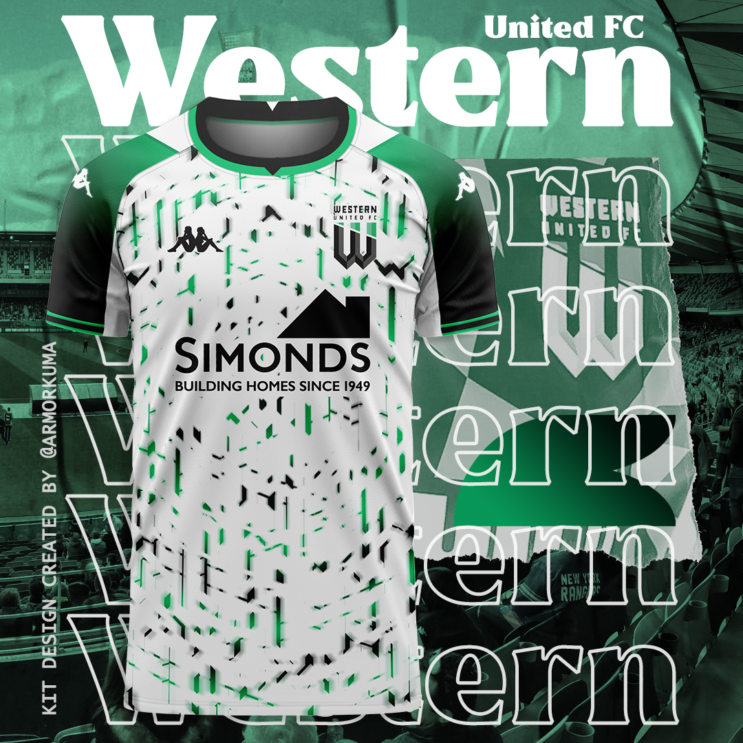 • Generic Description: An away kit for this Melbourne-based club that wants to fuse green and black in tons of shaded elements. This Western United FC shirt is created playing around with a pattern created starting from their unique logo.