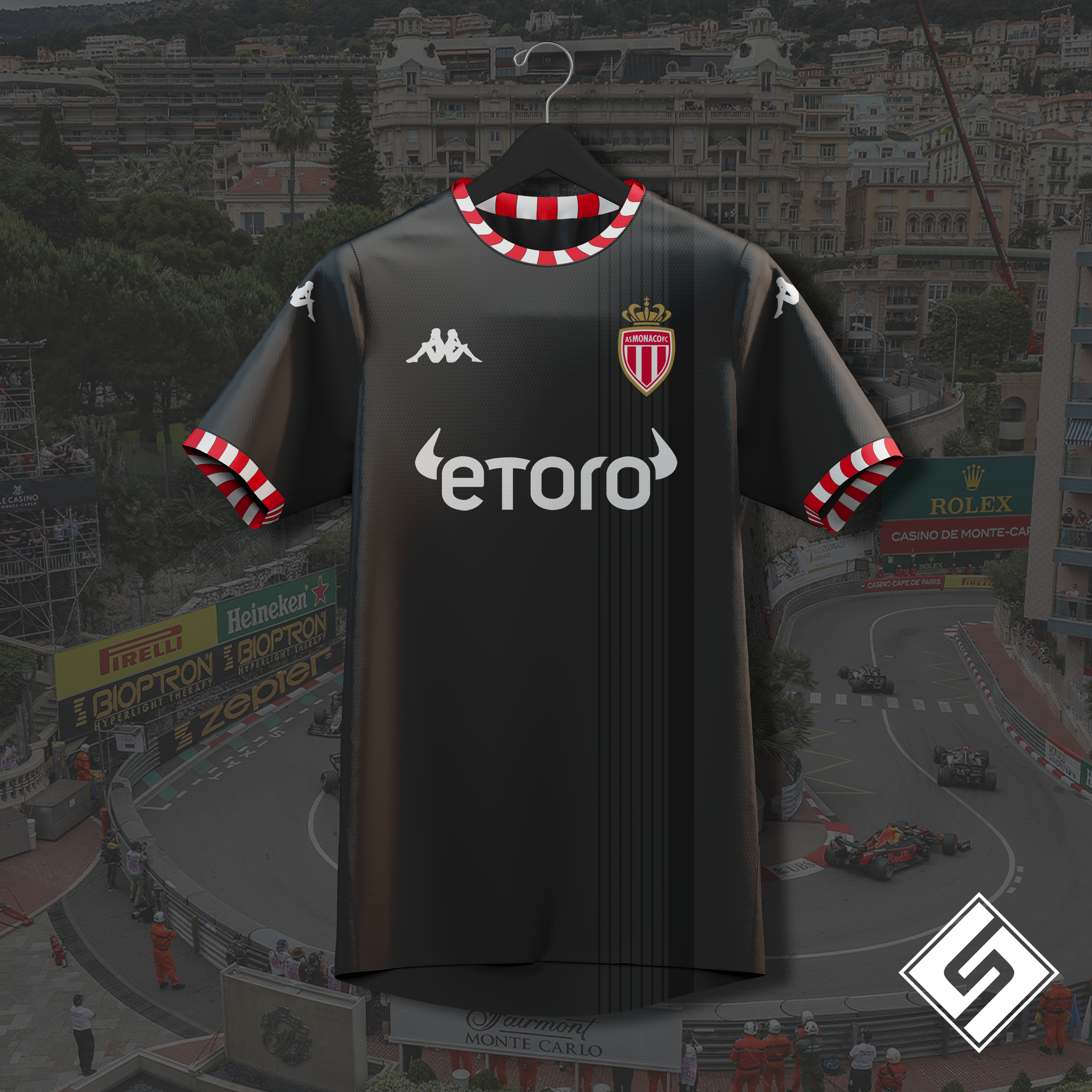 • Generic Description: An AS Monaco shirt inspired by the iconic F1 Monaco Grand Prix, with a red and white rumble strip-themed collar and cuff design, and "tire mark" stripe on the left side of the uniform.