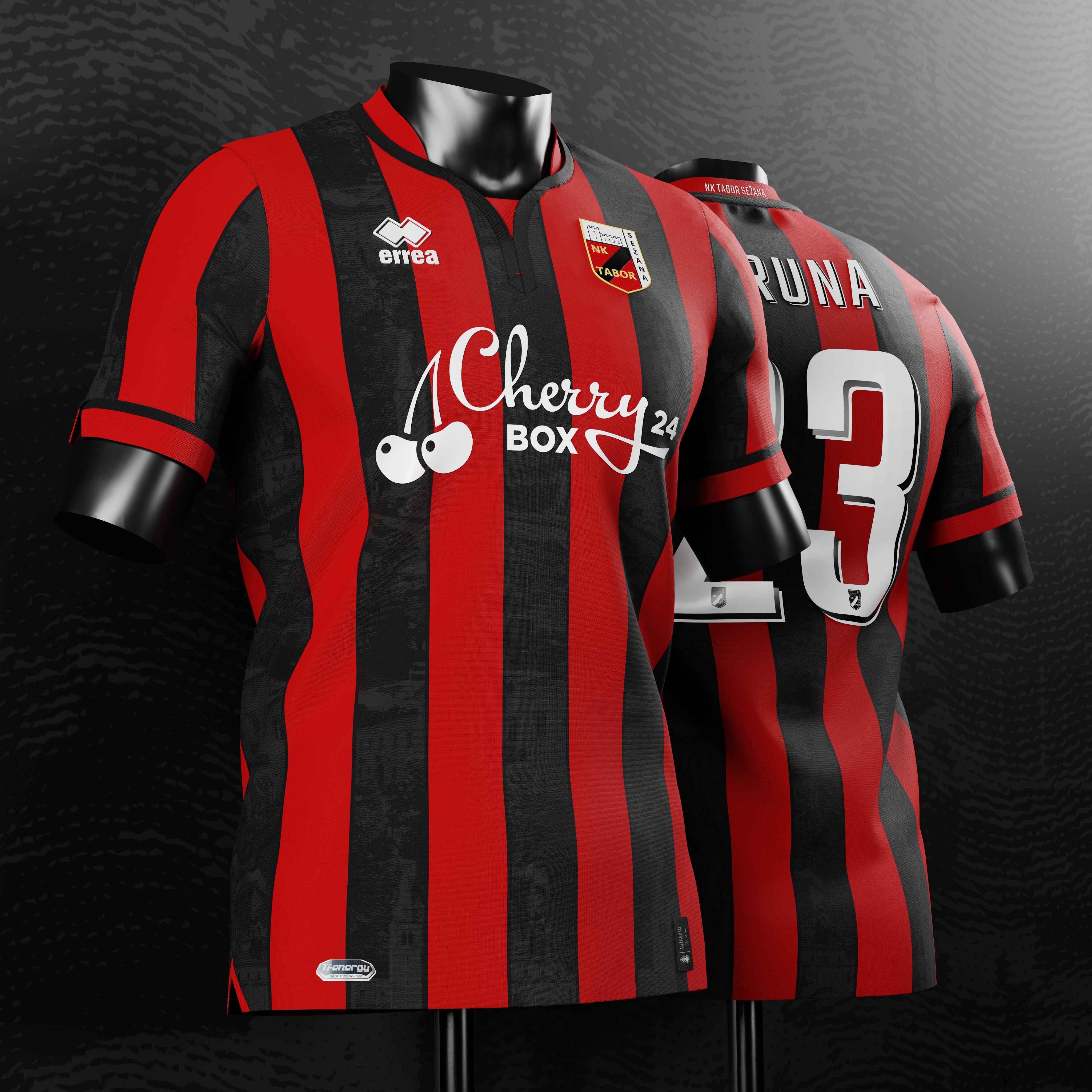 • Generic Description: Home shirt concept for Slovenian club Tabor Sežana. The jersey consists of their traditional bland-and-red striped design, but the black stripes feature a engraving-style graphic which depicts a few of Sežana's main landmarks.