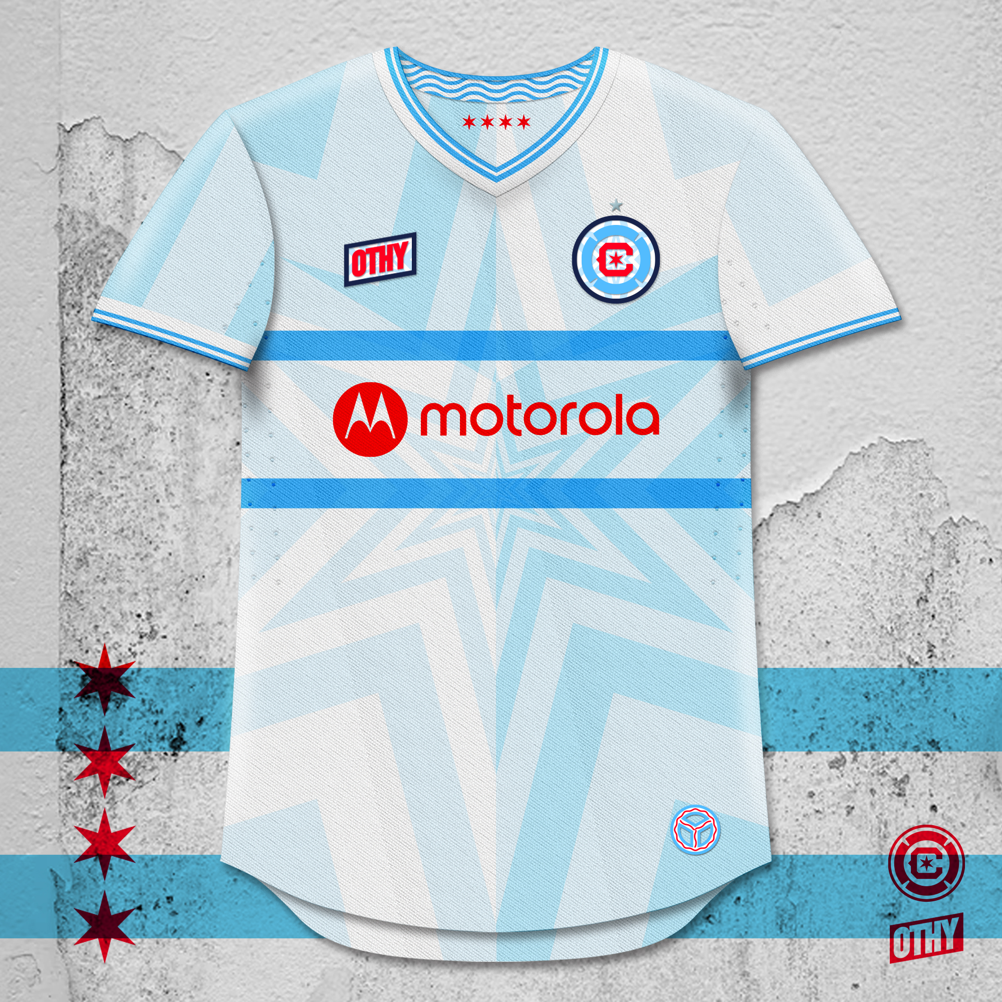 • Generic Description: This Chicago Fire away kit is inspired by the 2 most visible symbols of the city of Chicago - the city flag, and the Chicago "Y." The Chicago flag features a white background with 4 red 6-pointed stars between 2 light blue bars. The Y is a reference to the Chicago River and how it splits, forming a Y shape. These references take the form of a star pattern in a pale sky blue with a quartered split where the white is replaced by a pale blue and the blue is slightly darker. The split is formed by a vertical line and a chevron, creating a Y shape. The stars are featured on the inside back of the shirt, with waves (for the flowing river) on the neck tape. A Y symbol with waves - referencing the river - is at the bottom corner of the jersey front.  The star pattern is continued in the crest and OTHY logo.