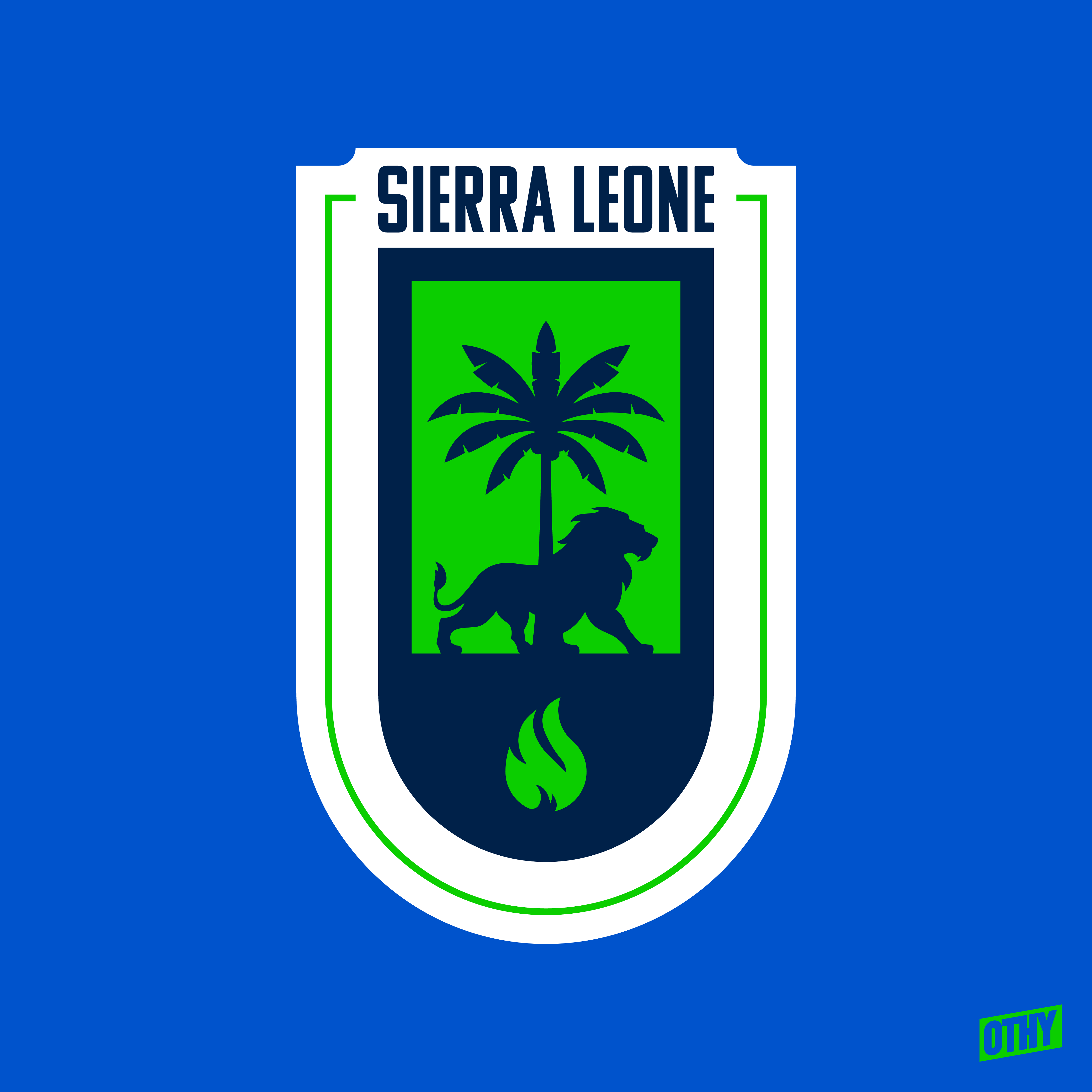 • Generic Description: This Sierra Leone crest takes elements from the nation's coat of arms. The 3 torches are consolidated into the flame at the bottom. The 3 lions and 2 palm trees are consolidated into the lion and palm tree in the center.