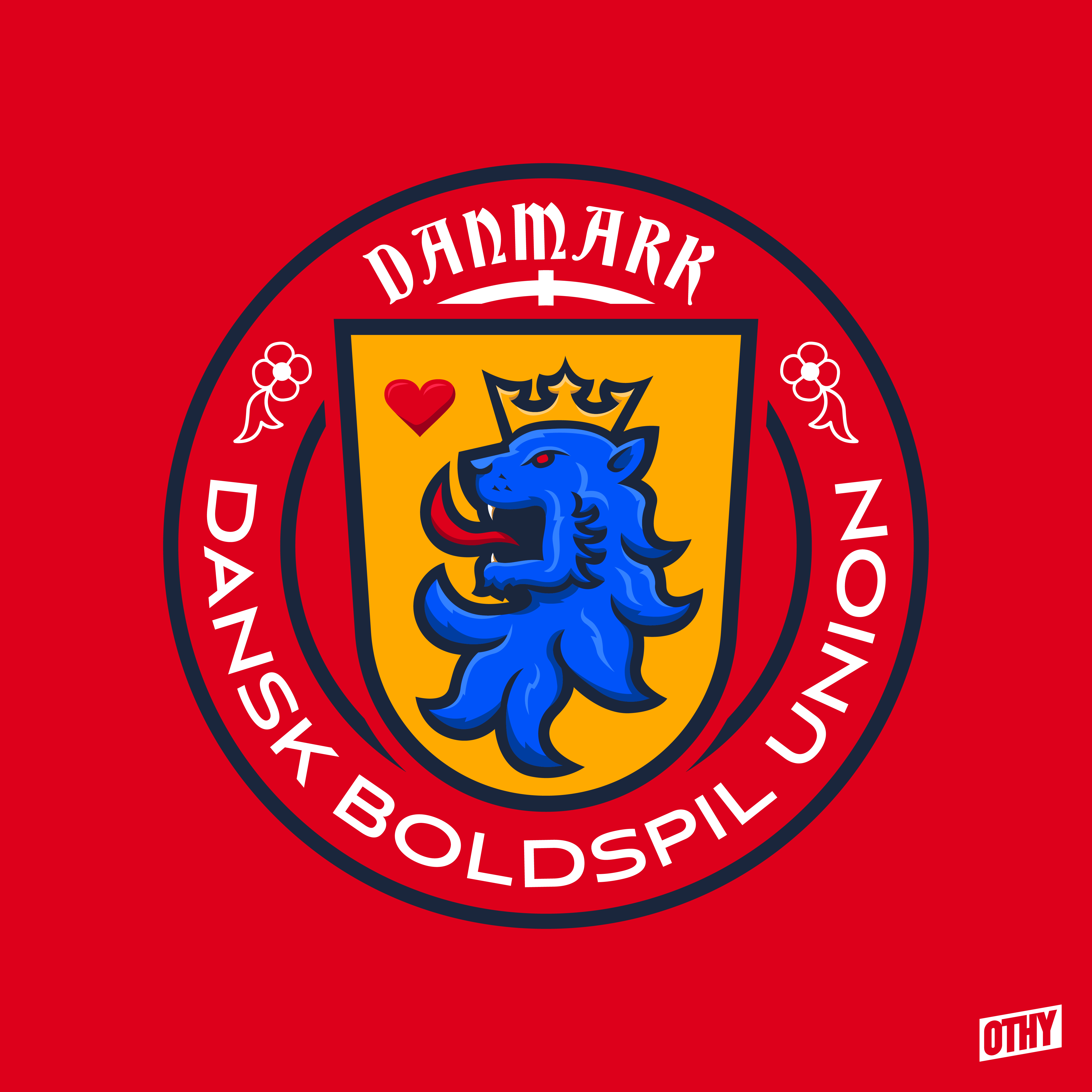 • Generic Description: This Denmark crest is based on the Danish coat of arms, with the gold shield, blue lion, and red heart. I've taken elements from the current crest - mainly the round shape and the flowers - and added a cross above the shield to represent the national flag.