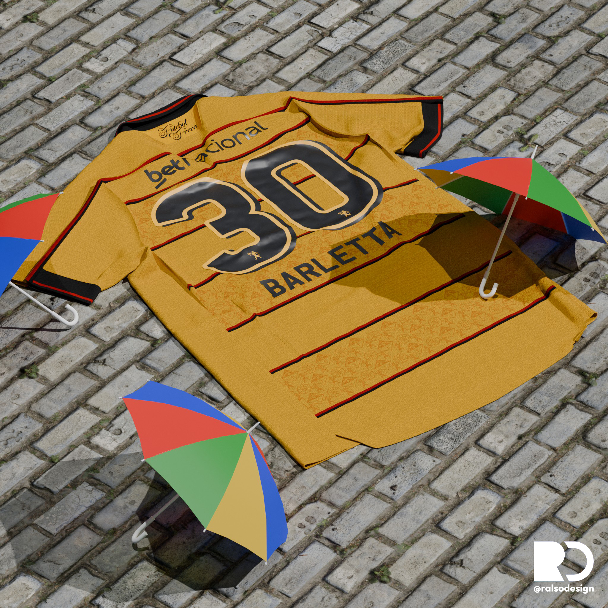 • Generic Description: Away shirt concept for Brazilian club Sport Club do Recife, with a graphic inspired by the Frevo - a typical dance from Recife/Pernambuco, which often uses multicoloured umbrellas as part of its choreography - and the flag of Pernambuco. On the back, a tag with the inscription "Futebol e Frevo" (Football and Frevo) can be seen.