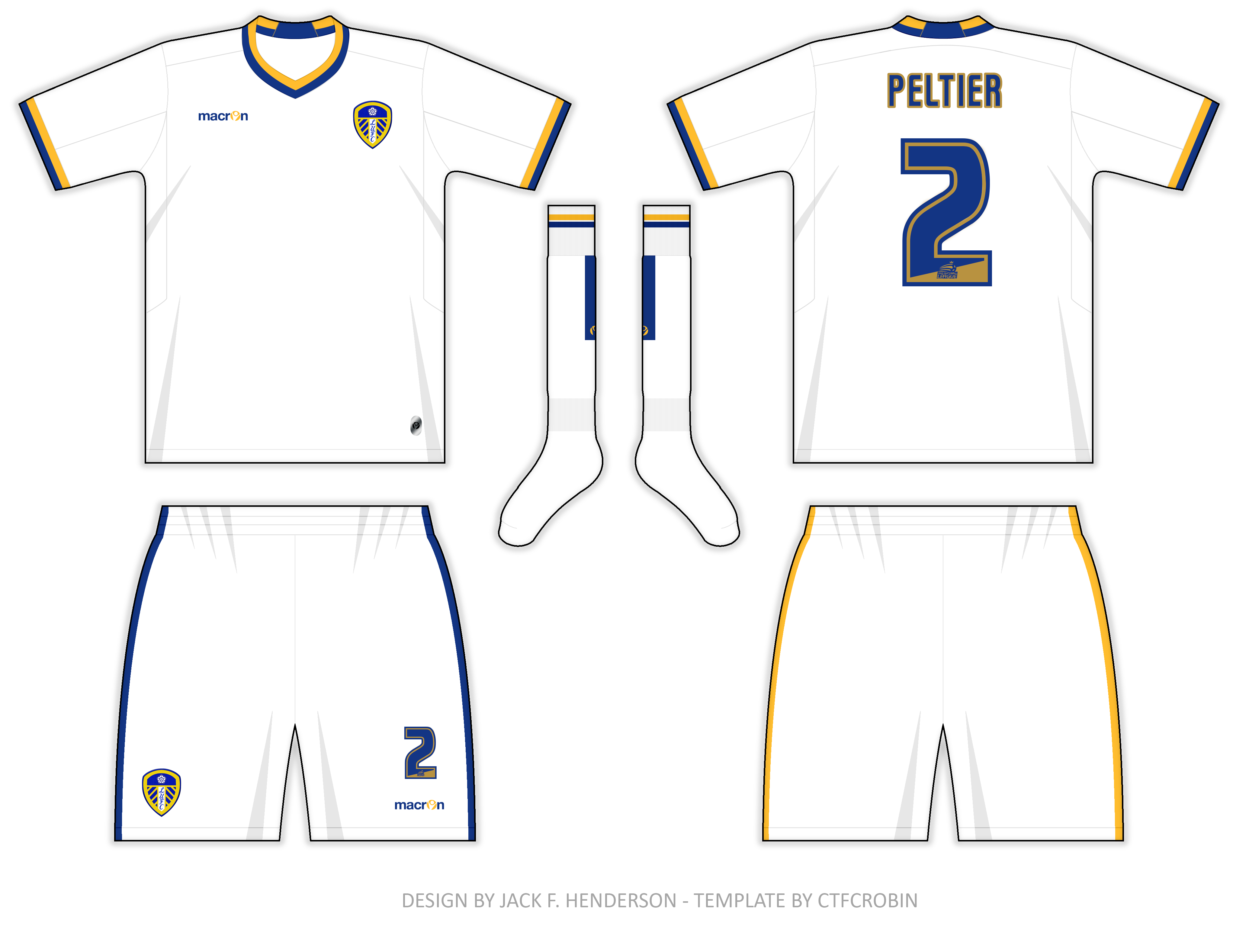 • Generic Description: So,here\'s my entry to this,plus a new presentation style. This shirt is basically the first Leeds all-white shirt from 1960 ,given a Macron spin.I didn\'t include the Macron blokes in the shoulders to give the shirt more of a retro feel.