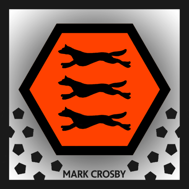 This is an amalgamation of a few Wolves crests. The hexagon and wolves are easily recognizable and because of that I\'ve chosen not to include any script.