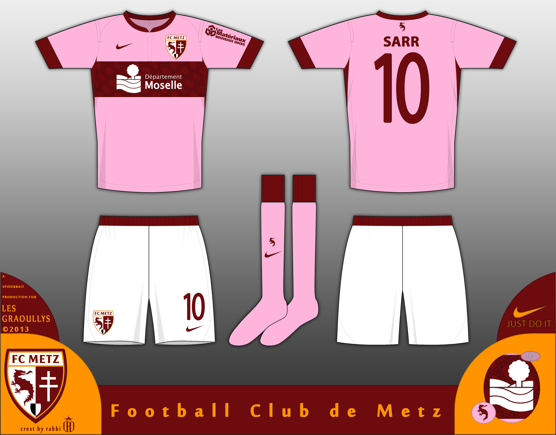 Change kit for Metz, Metz wore a Pink shirt with a Claret chestband for a few seasons when supplied by Kappa, a shirt that I thought was really nice, Ive did my take on it. There is a watermark of the roof from the Centre Pompidou-Metz on the chestband.
