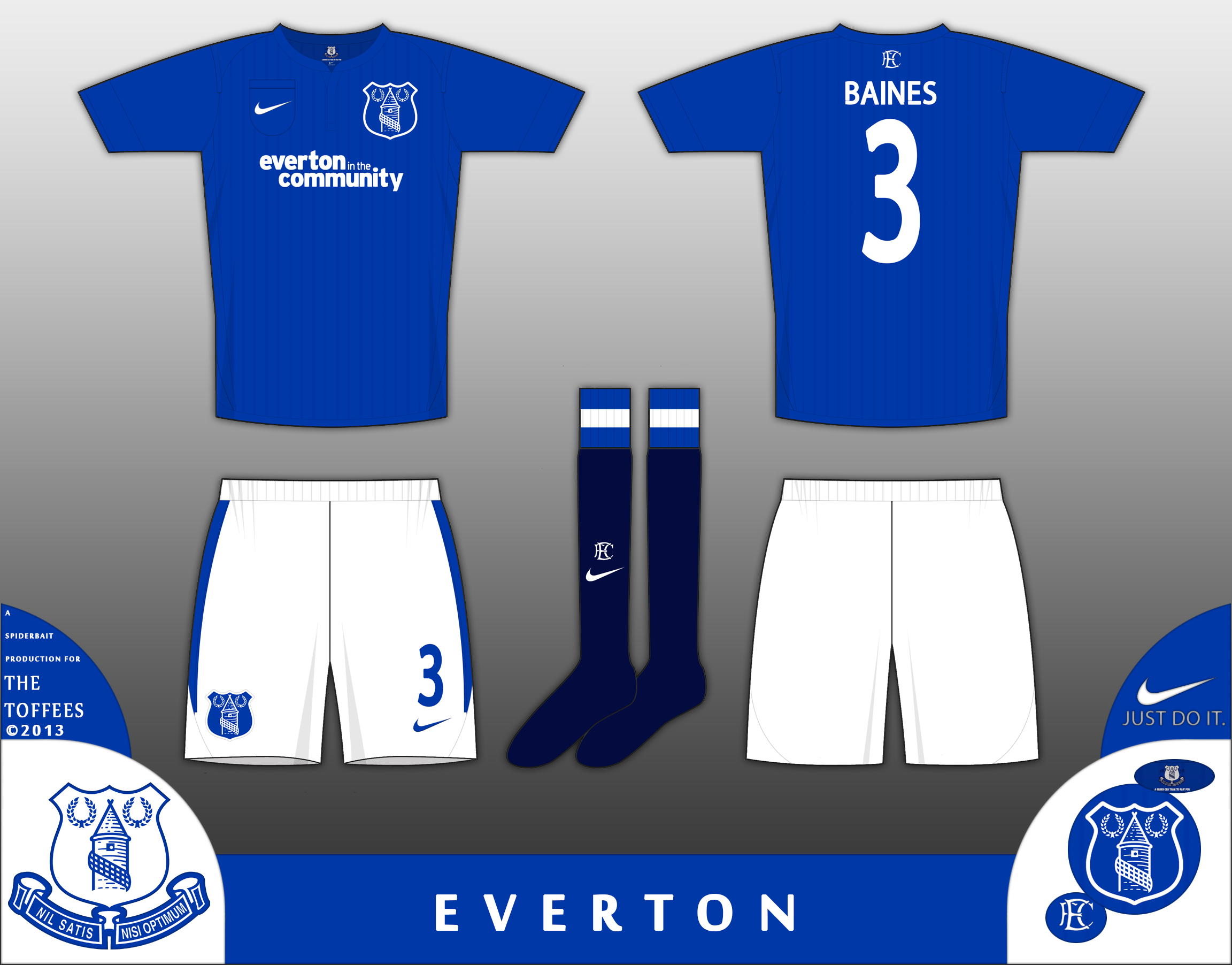 Home kit for the toffees, inspired by the kits from the 1930s and 1920s, with navy socks, shadow pinstripes, a pocket on the shirt, the EFC monogram on the socks and back of the shirt, and a simplified crest.