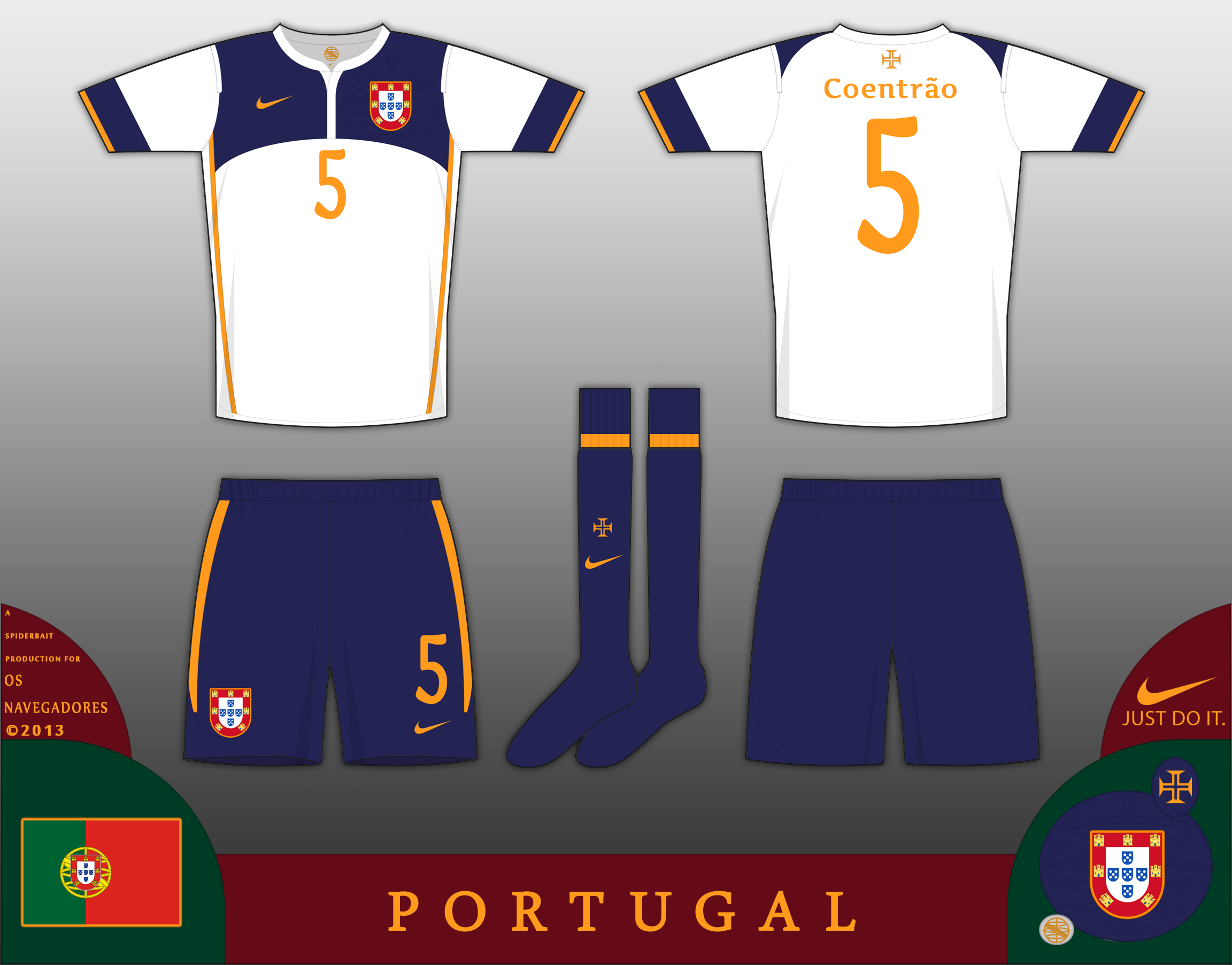 Change kit for Portugal, in white and blue, the colours of Portugal before 1910 and the colour of the Royal Family of Portugal. The blue is a navy shade, in light of the maritime history of Portugal.
