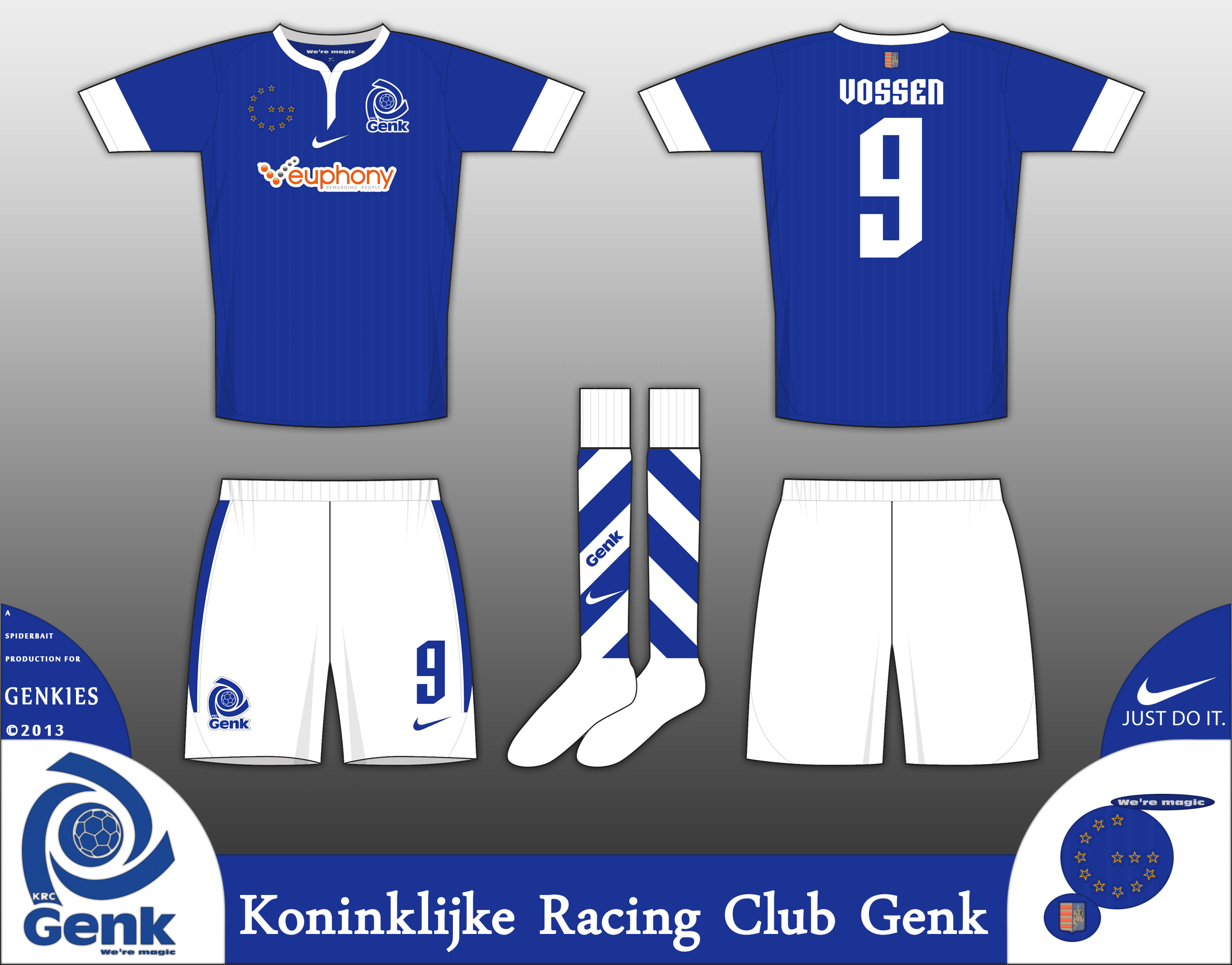 Home kit for Genk, in the traditional blue, and with white shorts and spiral sock pattern, and pinstripes on the shirt.