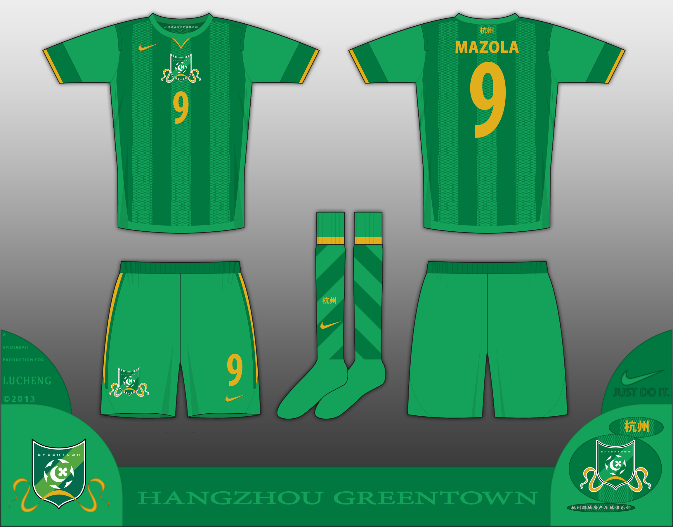 From the Yangtze River delta city of Hangzhou, Greentown (Lucheng) are a fixture in the Chinese top flight, and play in an all green home kit, with differing shades of green used. gold is used on the collar and cuffs, a new feature for Greentown.
