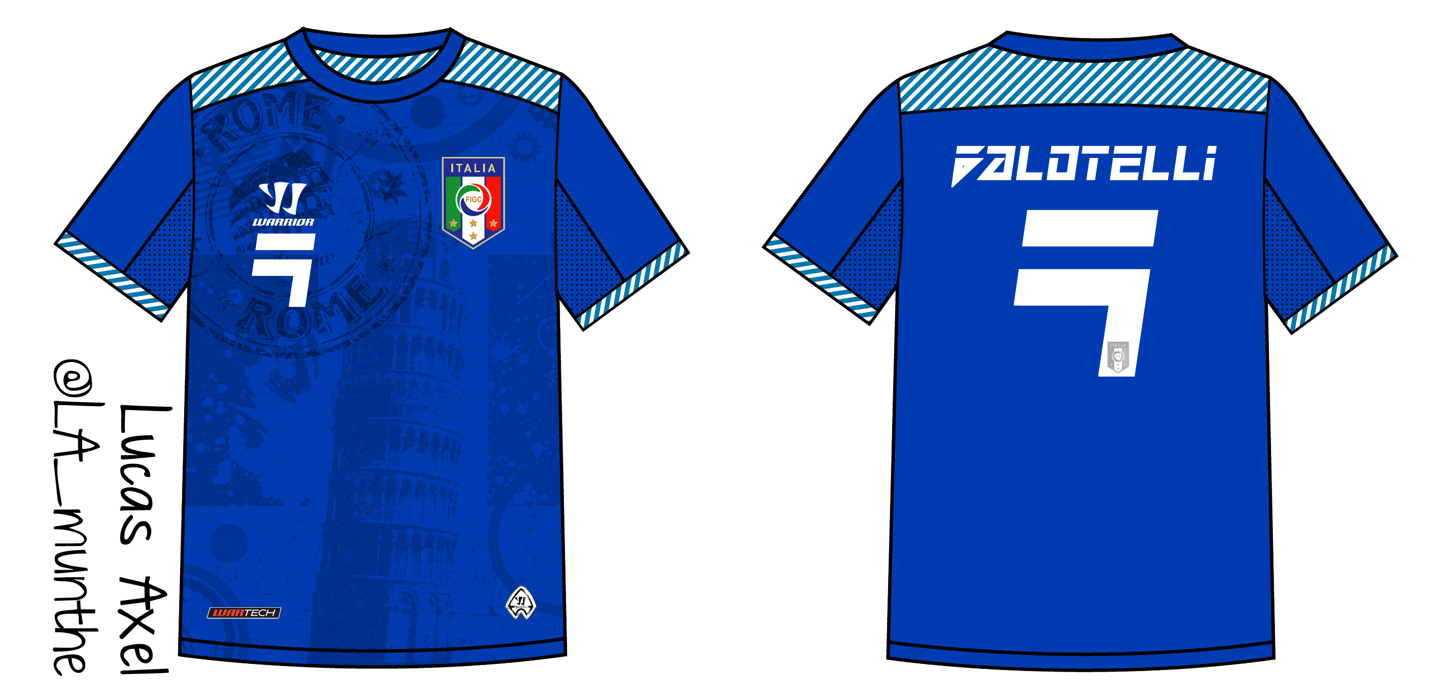This kit is mainly cobalt blue with the candy blue and white stripes pattern on the shoulder part. This kit also features the unique motive in front of the kit : The grunge vector art of Pisa Leaning Tower and the rubber stamp graphic of Colosseum in Rome to honour the Holy Roman Empire.
