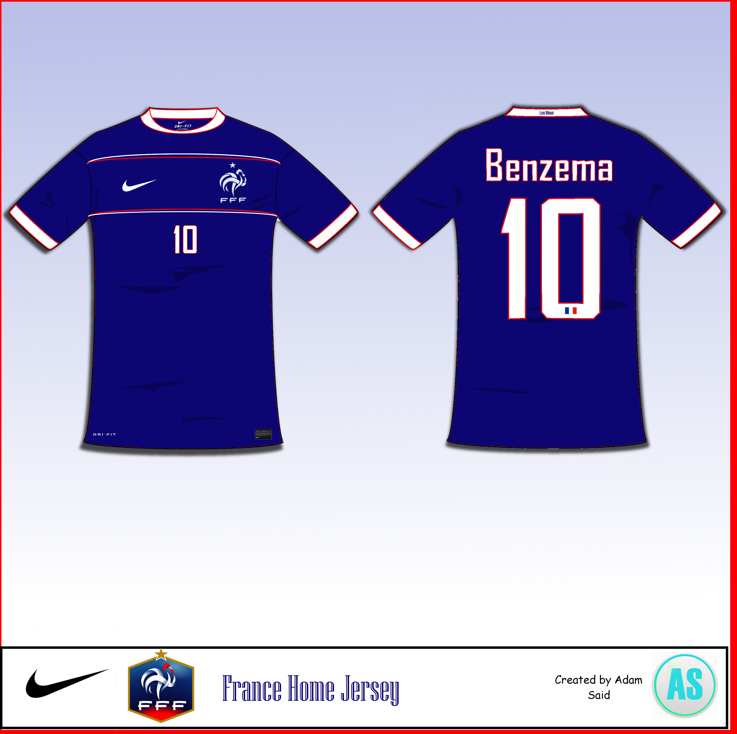 And now for the real description. This is a France jersey, and the main aspect of it is the middle arches surrounding the French, and Nike crests. I used an arch design basically because France is famous for its Arch bridges, which are widely viewed throughout the world. These bridges were mostly built in the Renaissance period, were the new world came to start. It was full of modern advancements. This was basically the platform for my design. Modern looks, which is shown through the numbers and the collar. The jersey is simply using the Famous Blue, Red, and white colour scheme. The cuffs are based off of the great French design cuffs, which really pop out for their size and colour. On the back is the great French national team Motto, Les Blues. The number on the back contains the French Flag, and the number is white with red outlines just like the rest of the jersey. I made a beginners mistake, of typing "Benzema" in lower case.