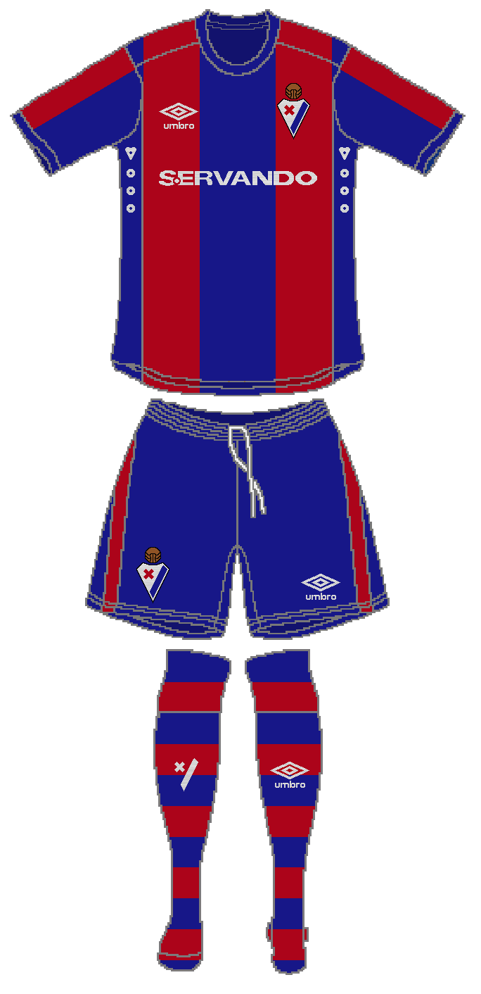 For the home kit I did a simple design. Eibar is famous for the Matallurgical Idustry, spacially for the weapons production, in fact, the club's nickname is "Armeros" (Gunsmiths), that's why I decided to use a metallic pattern for the logo and the side trims.