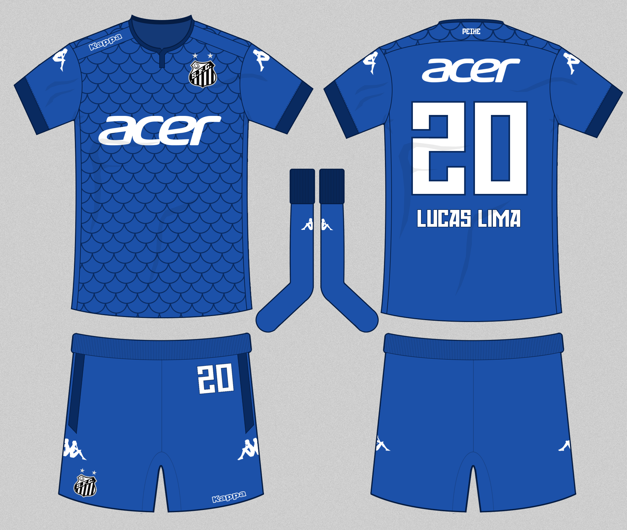 Kit uses a fish scale pattern, a nod to their nickname, "Peixe" (fish)