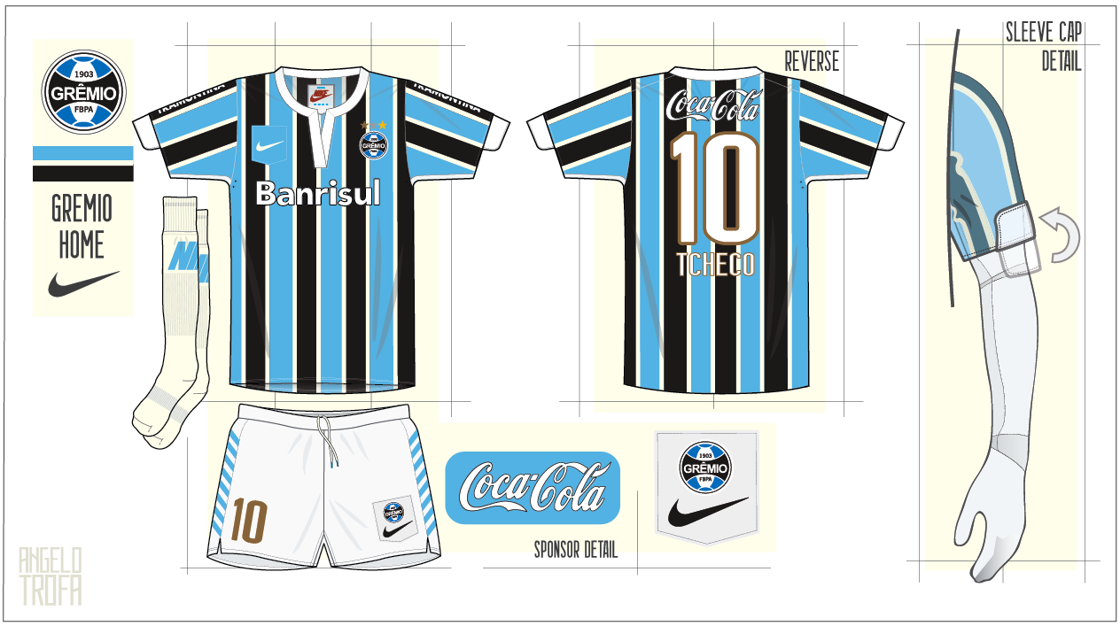 Using my Nike template I have created a kit for Gremio. I am a huge fan of the clubs kits, and love the early 2000\'s Kappa designs, however since then the PUMA efforts have not been as good. One change I made here is to turn the white stripe a subtle cream colour, this colour is carried on to the socks.